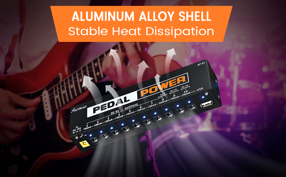 - 10 مخرجات معزولة لدواسة الجيتار: 4 * 9 فولت 100 مللي أمبير + 3 * 9 فولت 300 مللي أمبير + 1 * 9 فولت 500 مللي أمبير + 1 * 12 فولت 300 مللي أمبير + 1 * 18 فولت 100 مللي أمبير، قوة 10 دواسات تأثير في وقت واحد دون أي واجهة