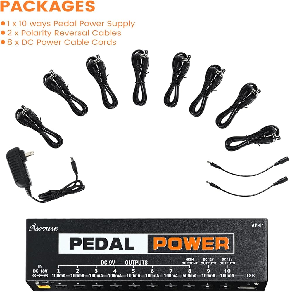 - يأتي مع 10 × كابلات إمداد طاقة دواسات، 1 × محول تيار متردد 18 فولت 100 مللي أمبير معزول للضوضاء، 2 × كابلات عكس القطبية، 1 × دليل المستخدم.