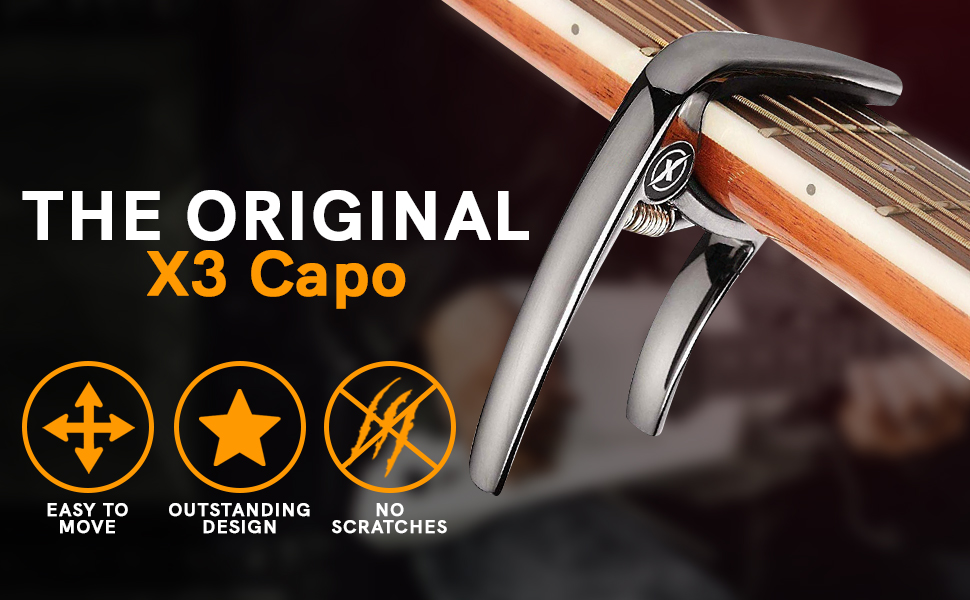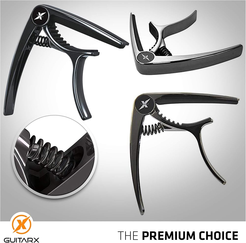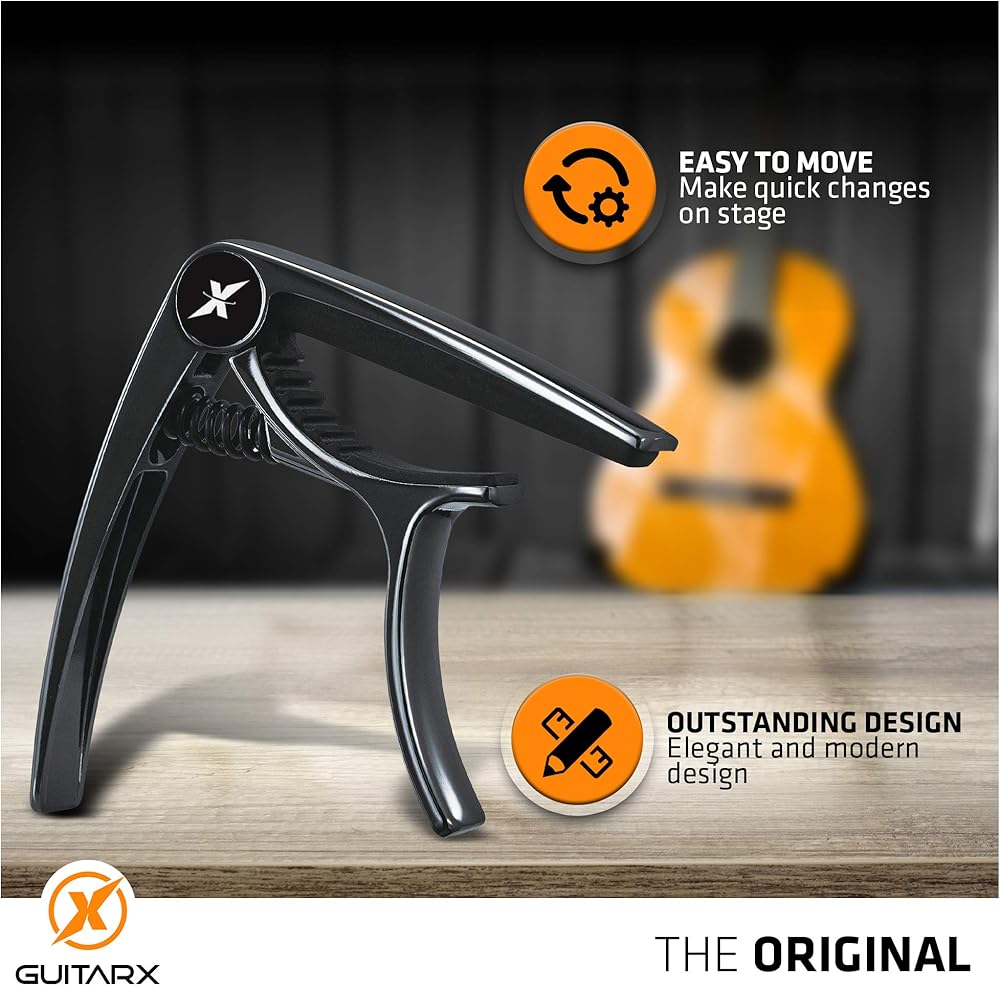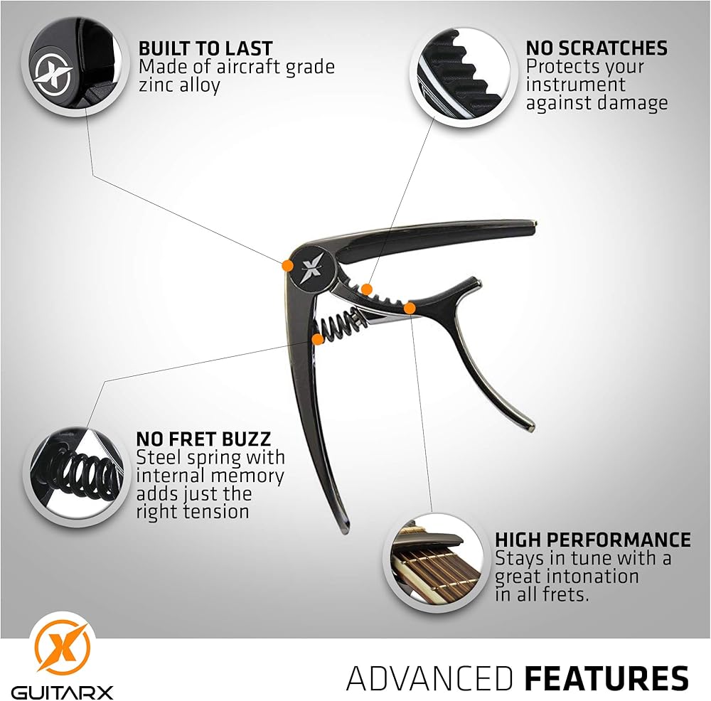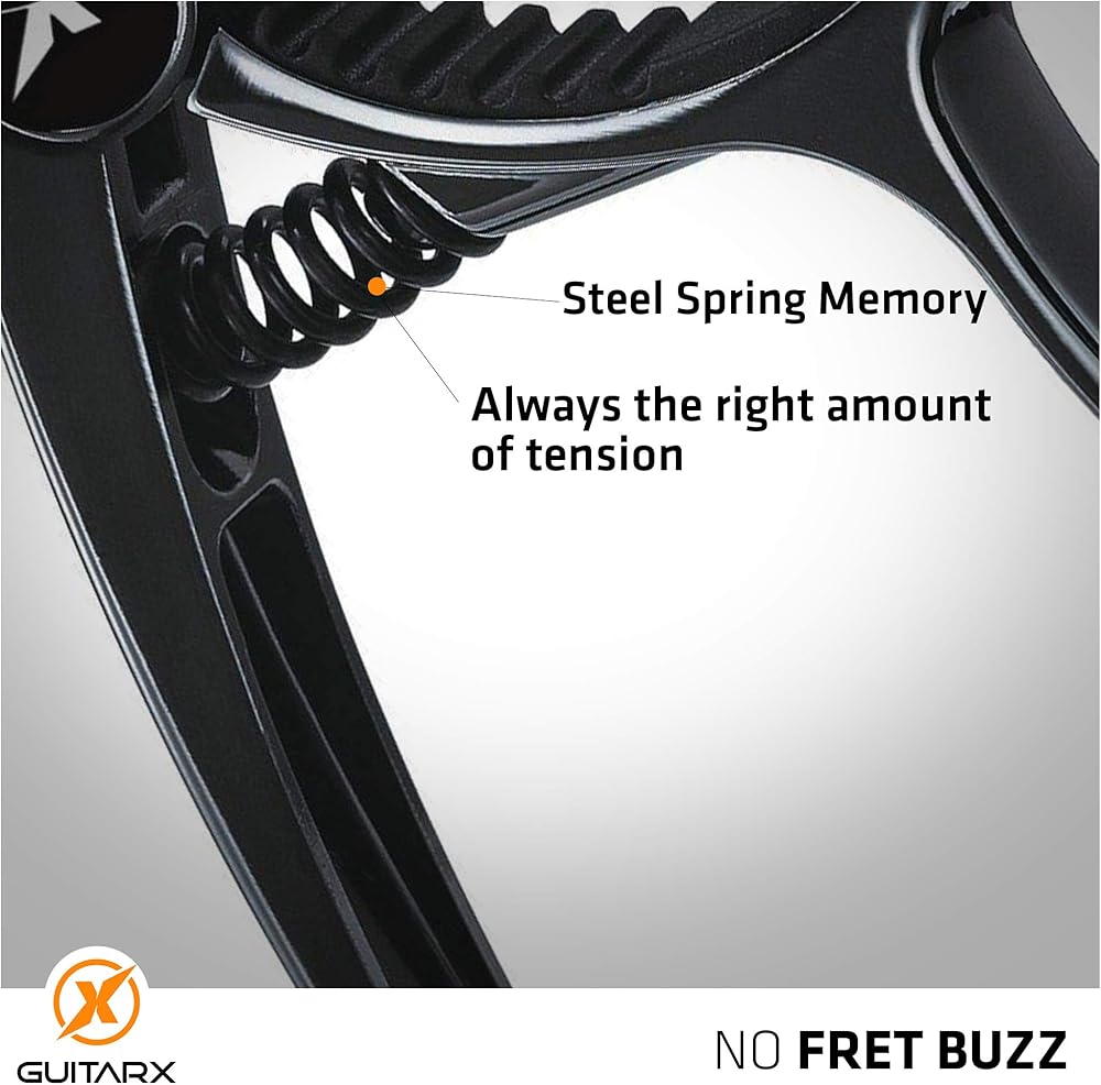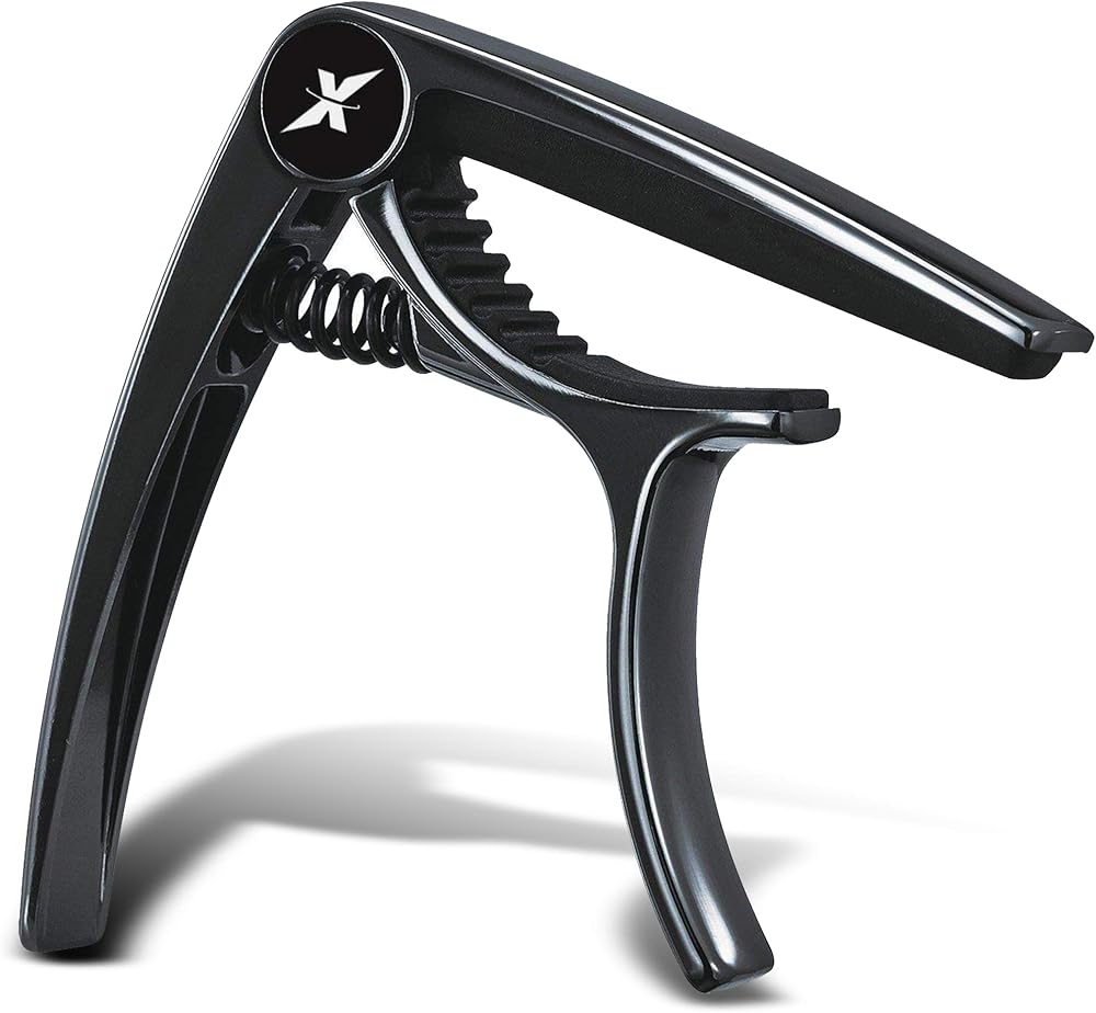 X Capo للجيتار الصوتي، كابو الجيتار الكهربائي - أيضًا للباس والقيثارة والبانجو والمندولين - العلامة التجارية رقم 1 بين كابو الجيتار - سبائك الزنك، معدن لامع أسود