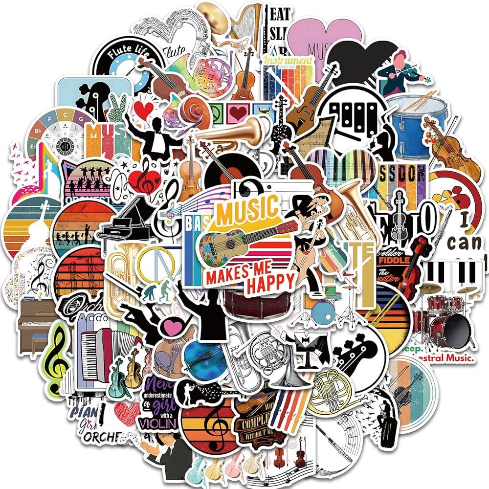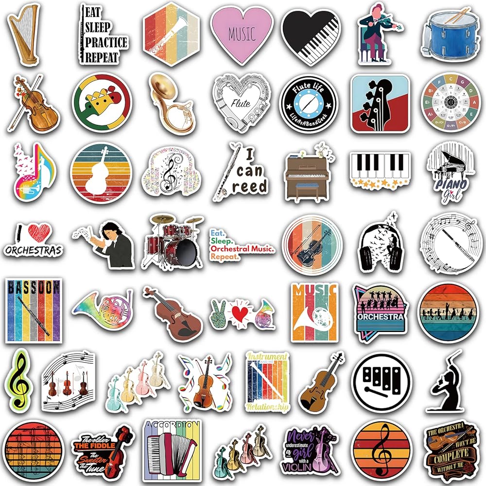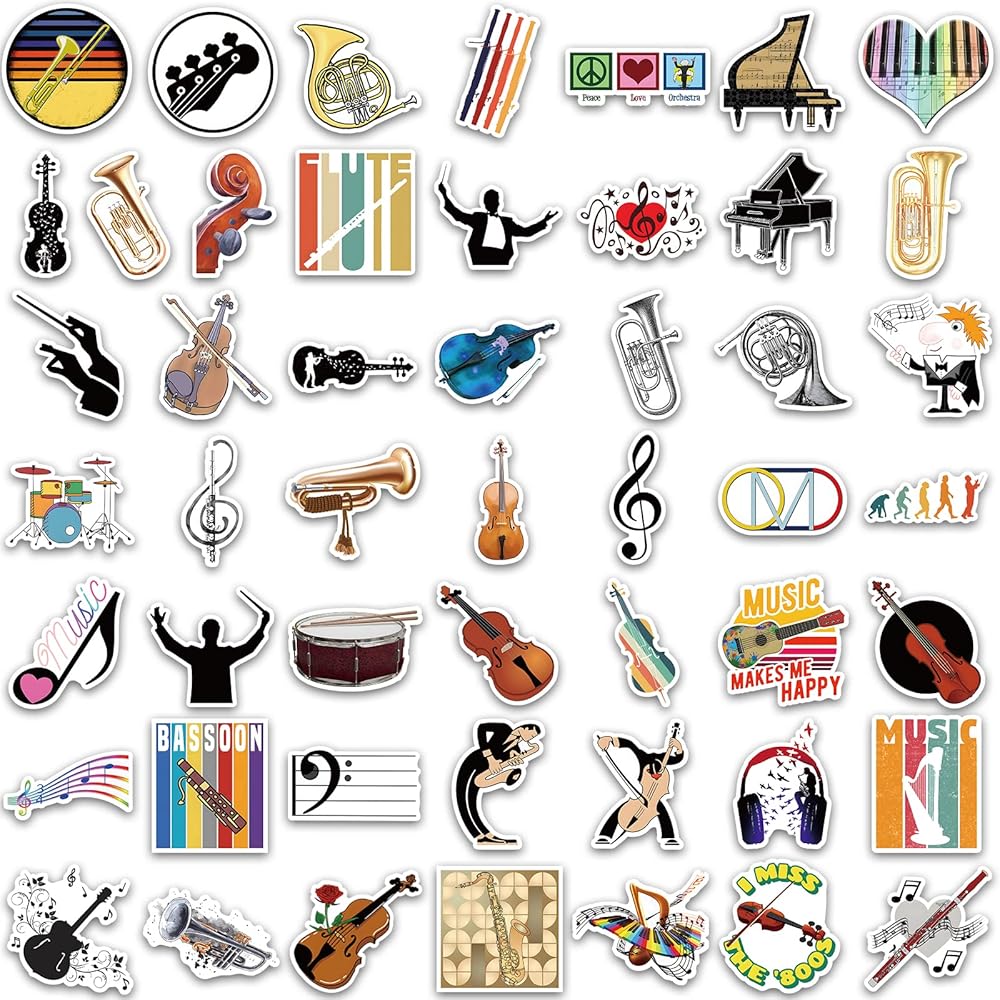 ديكور مثالي يمكنك صنعه بنفسك: ملصقات الموسيقى الأوركسترا للأطفال لطيفة للغاية. يمكن أن تكون الملصقات الجمالية للموسيقى الكلاسيكية ملصقات لزجاجات المياه وملصقات لوح التزلج وملصقات اللاب توب.