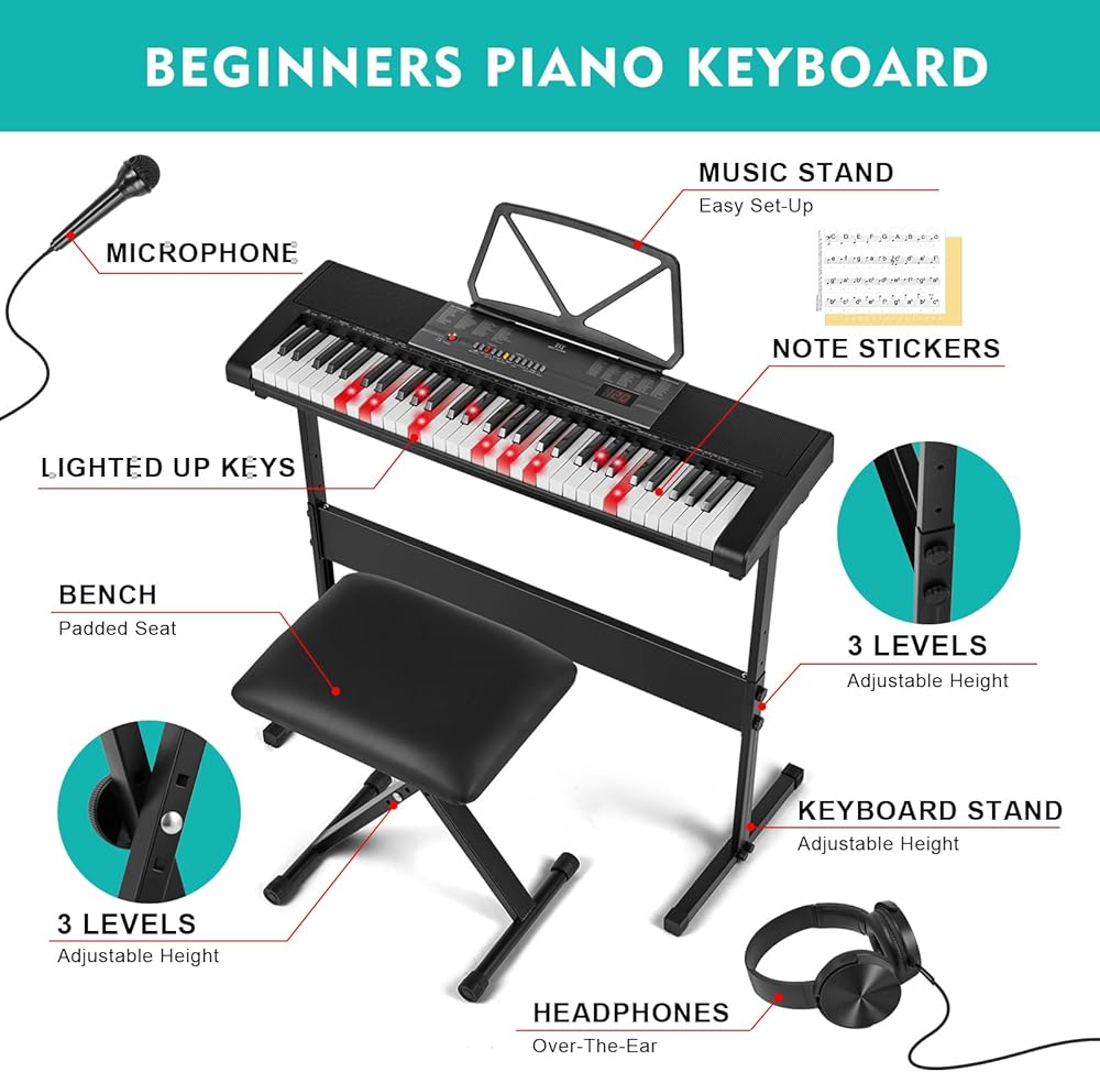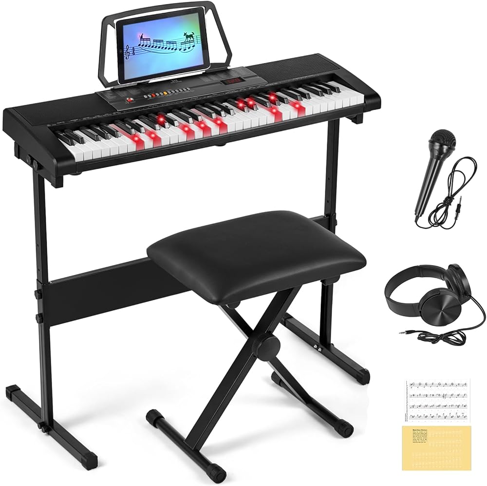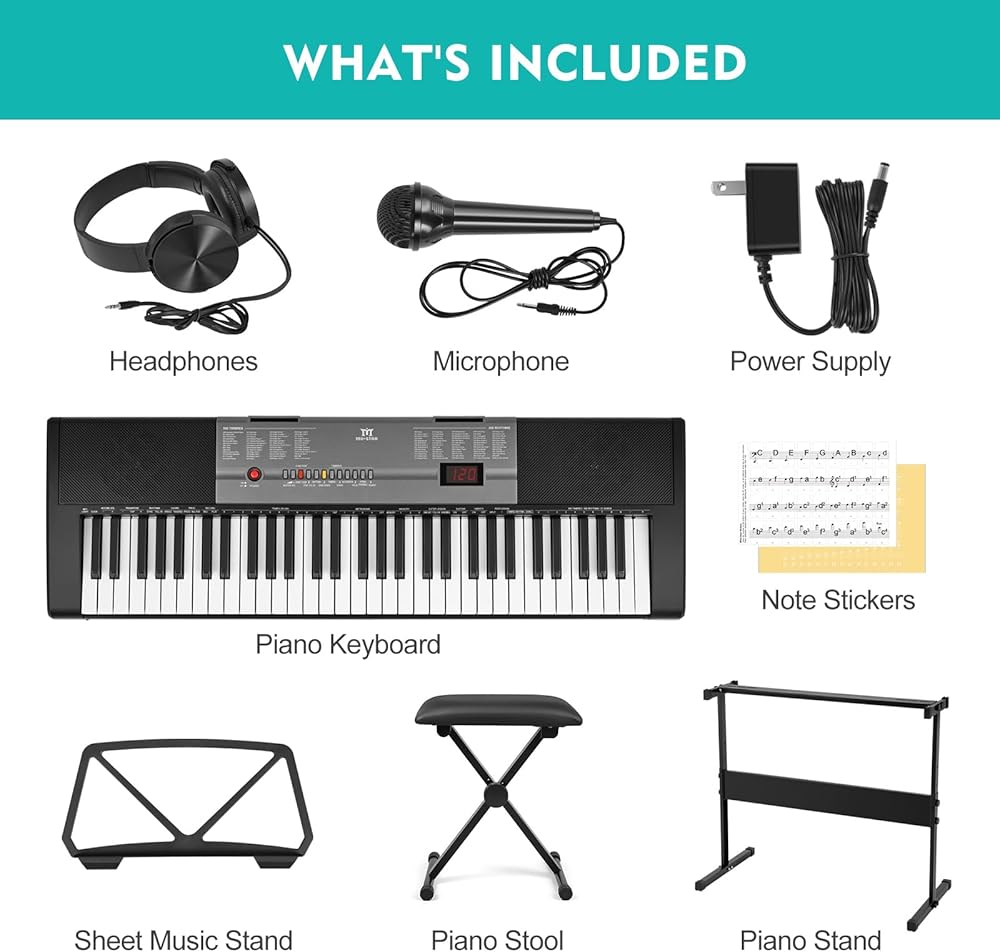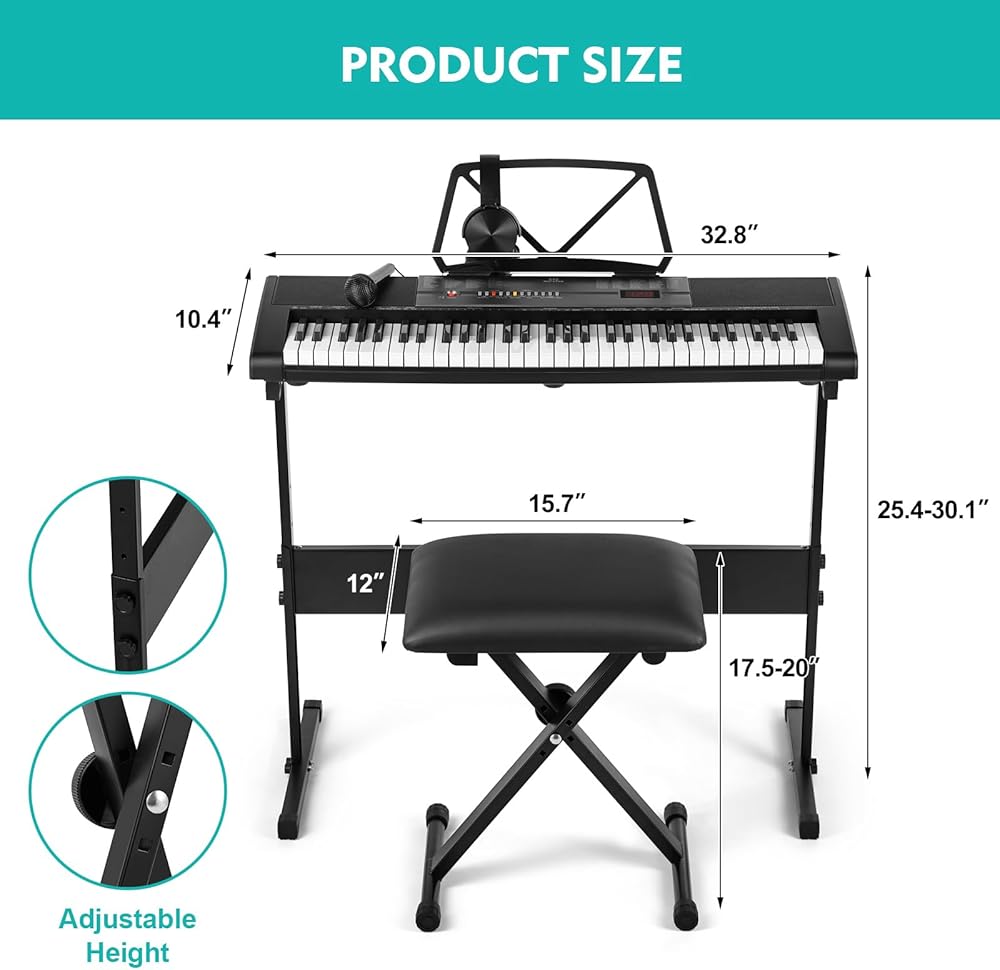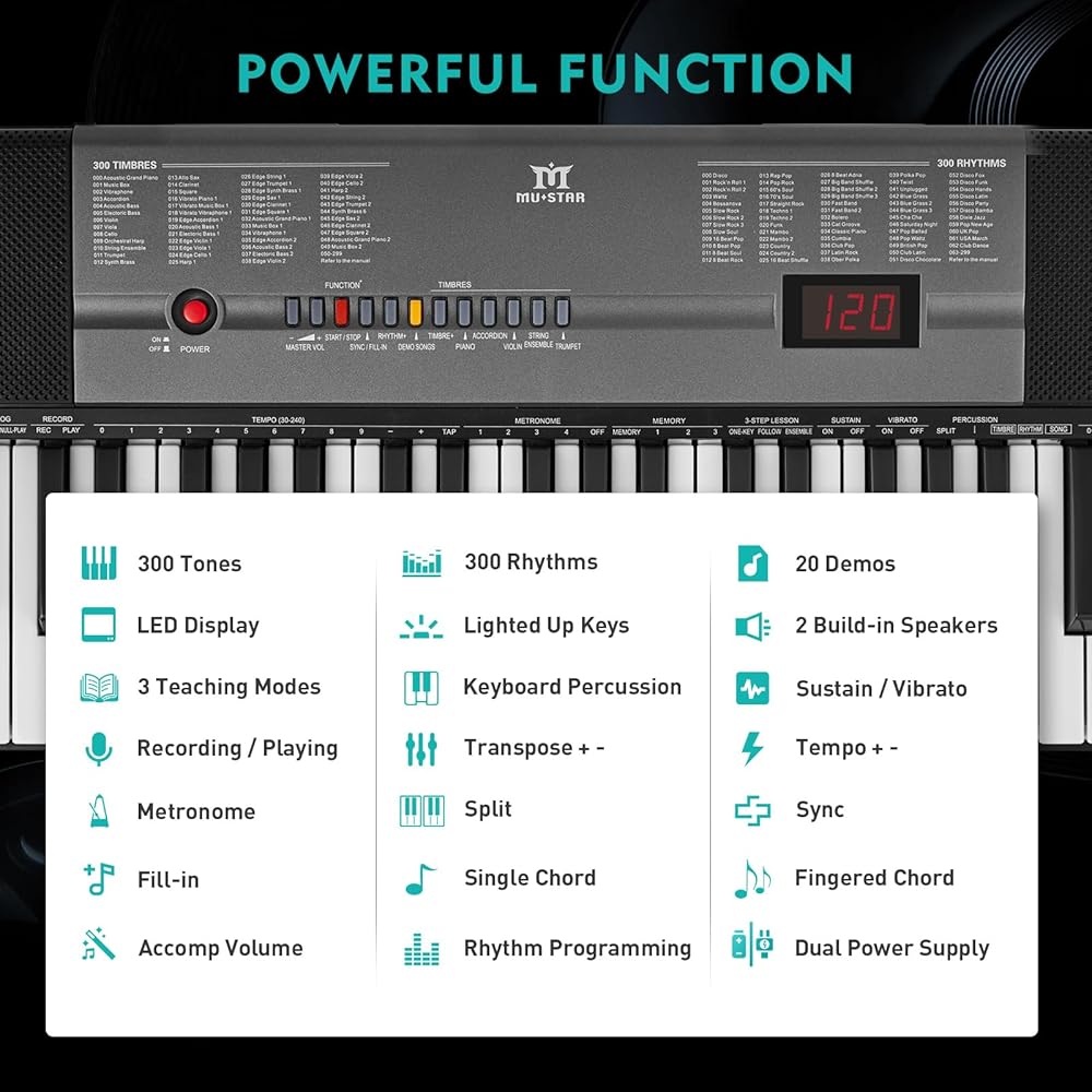لوحة مفاتيح البيانو MUSTAR، 61 مفتاح بيانو مع مفاتيح مضيئة، بيانو كهربائي لوحة مفاتيح بيانو محمولة للمبتدئين مع حامل، دواسة مستدامة، سماعات الرأس، ميكروفون