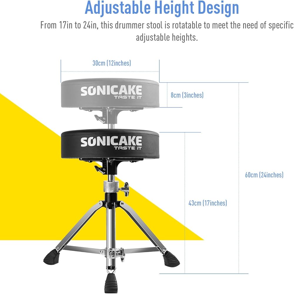 مضاد للانزلاق: يحتوي هذا المقعد ذو الأرجل الثلاثة على ثلاثة أكمام مطاطية مضادة للانزلاق لمنع عرش الطبل سونيكيك من التحرك عند العزف على الطبول.