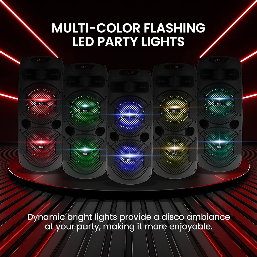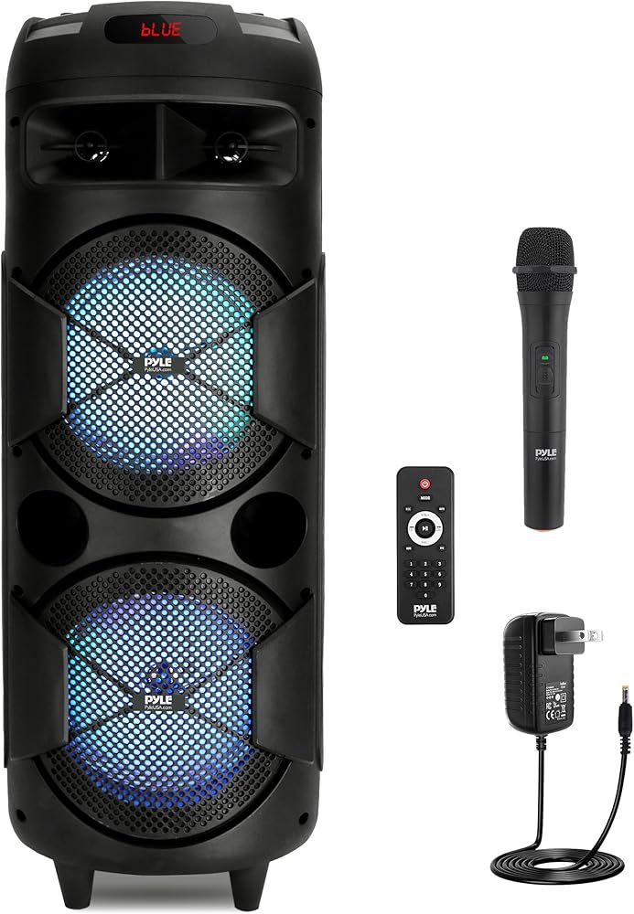 شاشة LED رقمية: مكبر صوت بلوتوث Pyle نظام كاريوكي PA مجهز براديو FM مع شاشة LED رقمية، قارئ محرك فلاش USB للعمل كمشغل MP3، مدخل AUX 3.5 مم، ومدخل ميكروفون 6.5 مم. تحتوي على جهاز تحكم عن بعد وميكروفون لاسلكي