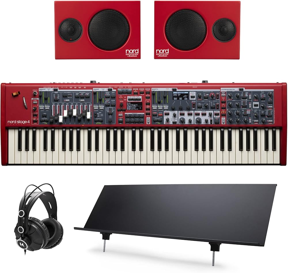 حزمة لوحة المفاتيح Nord Stage 4 المدمجة ذات 73 مفتاحًا وشبه مرجحة مع شاشة Nord Piano V2 (زوج)، وحامل الموسيقى Nord، وسماعات الرأس (4 عناصر)