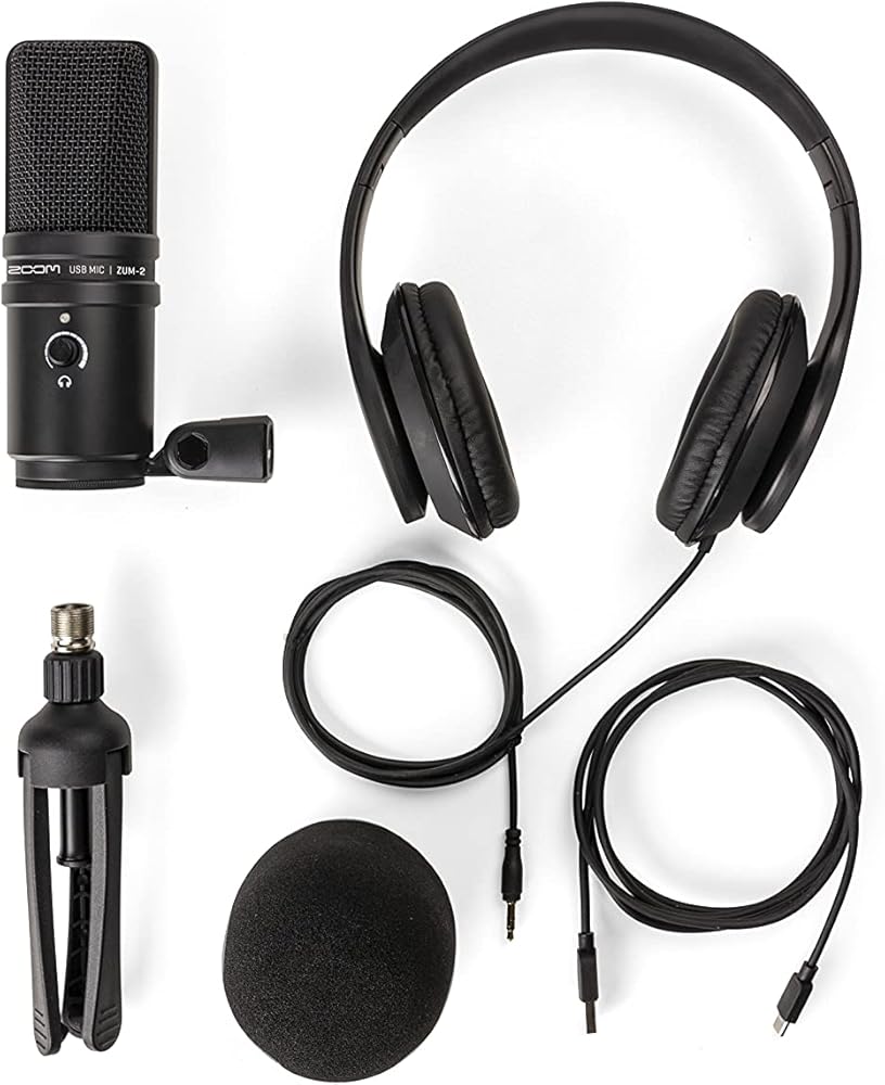 Zoom ZUM-2 Podcast Mic Pack، ميكروفون Podcast USB، سماعات الرأس، حامل ثلاثي القوائم، الزجاج الأمامي، كابل USB، لتسجيل وبث الملفات الصوتية والموسيقى والتعليقات الصوتية والمزيد.