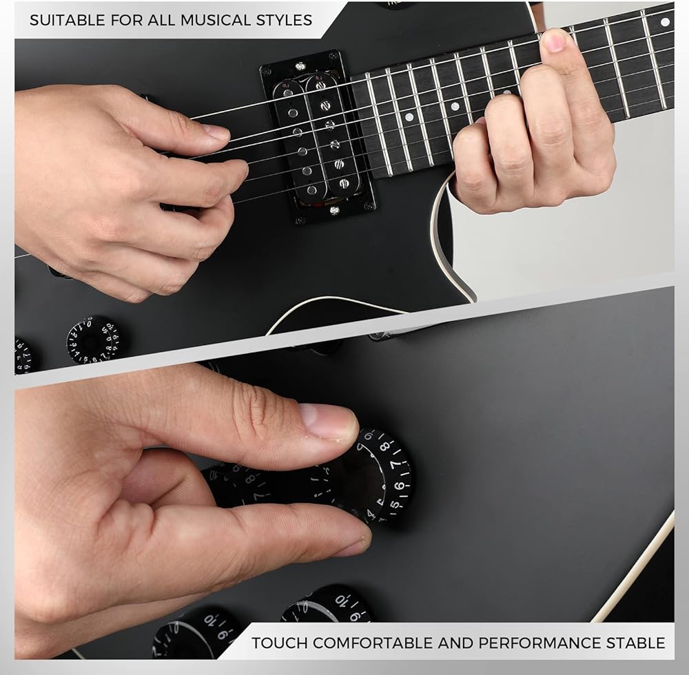 【صوت متنوع】 مع مفتاح الالتقاط ثلاثي الاتجاهات، و2 تحكم في مستوى الصوت و2 تحكم في النغمة، يمكن للجيتار استيعاب جميع أنواع الموسيقى التي تريد تشغيلها.