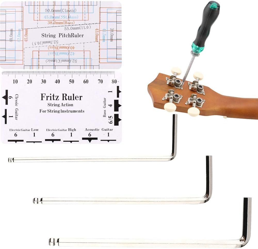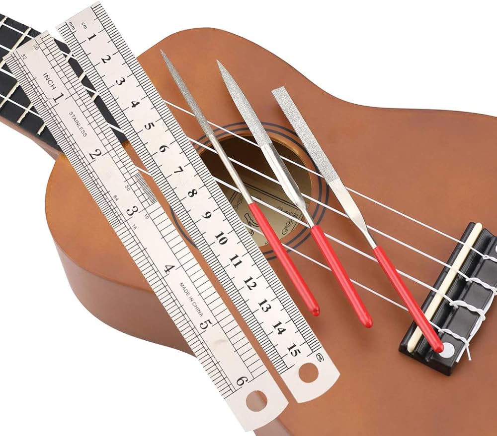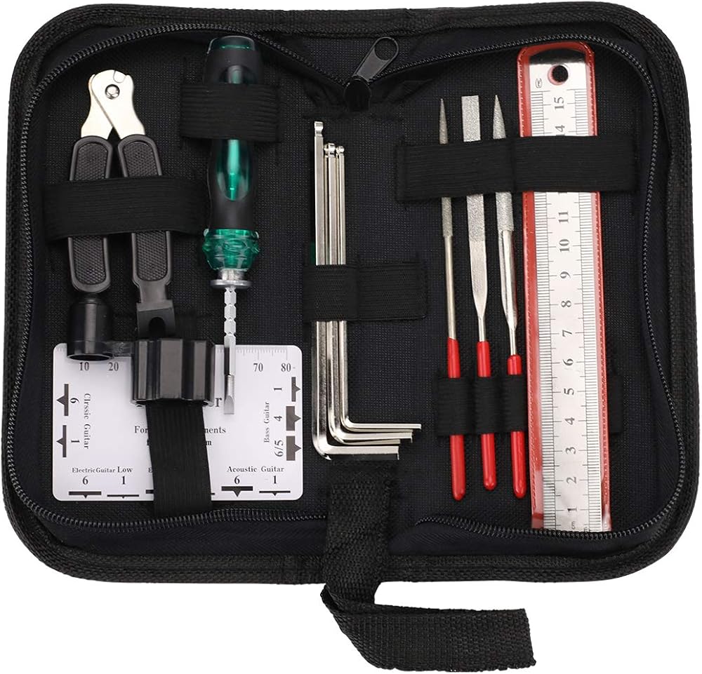 مجموعة إصلاح كاملة: مجموعة أدوات الغيتار تشمل: 3 مبرد، 3 مفتاح سداسي، 1 مفك براغي، 1 مسطرة فولاذية، 1 مسطرة عمل سلسلة، 1 مسمار قاطع خيط الغيتار، 1 حقيبة تخزين.