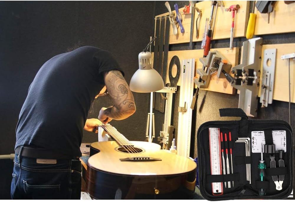 مجموعة أدوات الجيتار - مصممة خصيصًا للمساعدة في إكمال إصلاحات وتعديلات الغيتار الأكثر شيوعاً. يحتوي على بعض الأدوات الأكثر فائدة وشعبية وسعيبة في البحث عن الصيانة والإصلاح.