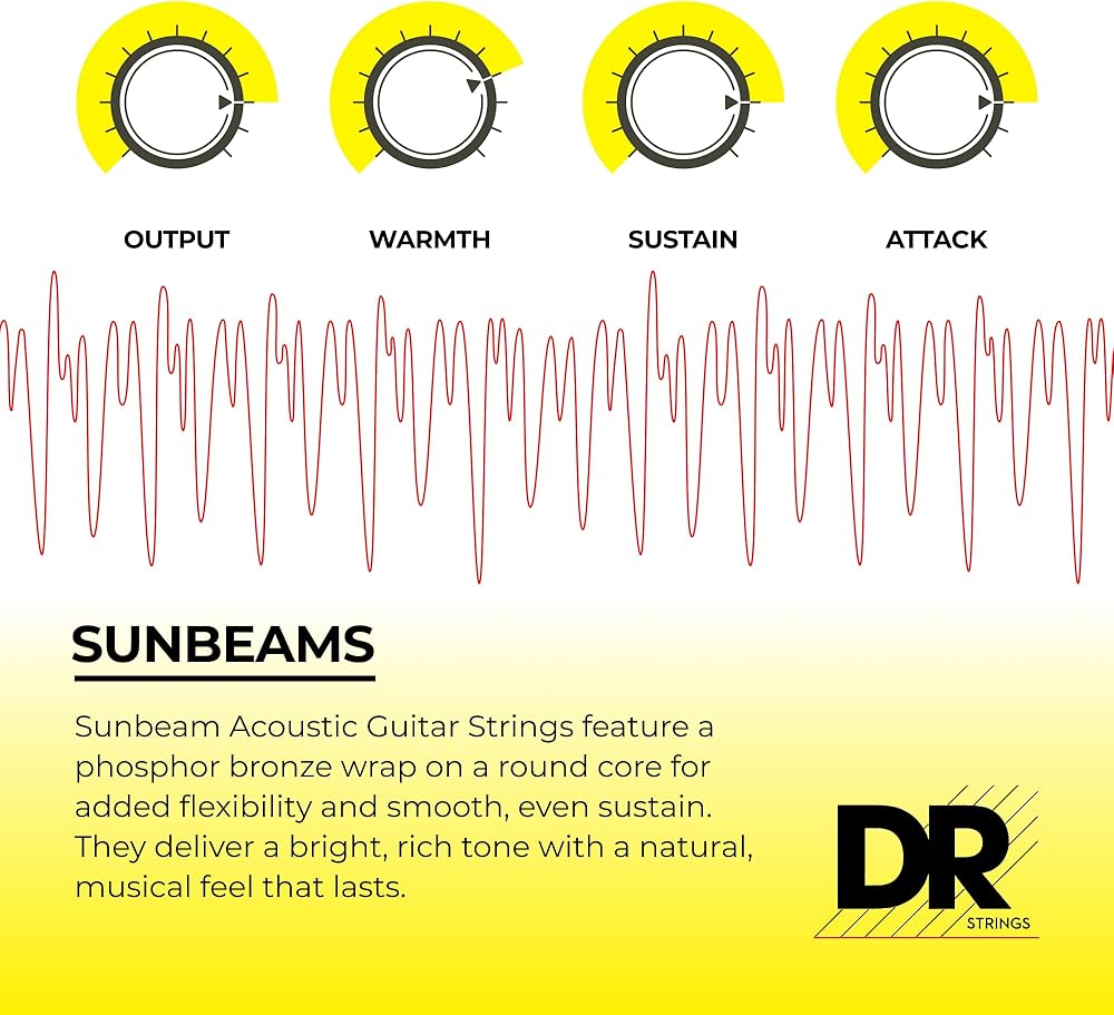 خيوط برونزية فوسفور شعاع الشمس ملفوفة يدويًا على قلوب مستديرة مما يعطي نتيجة رائعة. استدامة رائعة. استدامة رائعة. لا يبدو أن النغمة تتحلل كما هو الحال مع الأوتار البرونزية الفوسفورية الأخرى، والتي نعتقد أنها تتحلل في منحنى. يبدو أن فوسفور شعاع الشمس يظل في خط مستقيم حتى "يسقط" الصوت. تتميز فوسفورات شعاع الشمس أيضًا بأنها مشرقة وغنية من الناحية الموسيقية. بالإضافة إلى ذلك فهي مرنة للغاية. أكثر من أي سلسلة أخرى لعبناها.