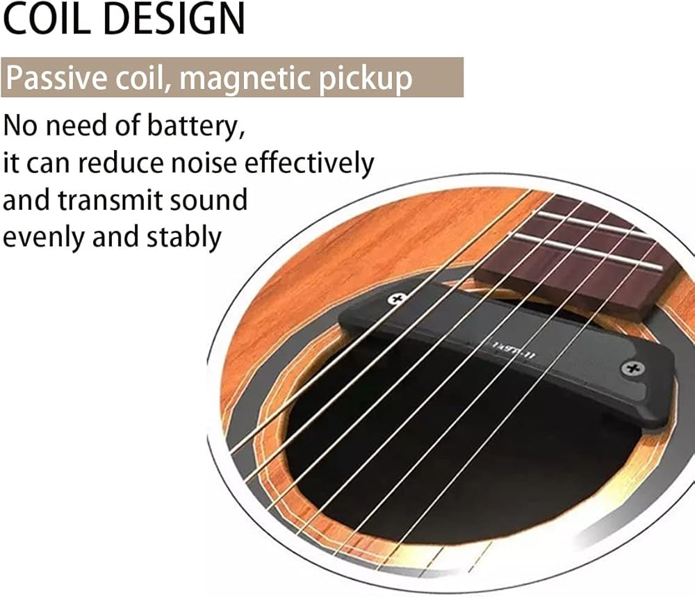 【 هيكل مغناطيس نيوديميوم】التقاط جيتار صوتي لتحقيق توازن استثنائي للسلسلة ووضوح صوتي ساطع. تصميم منخفض المستوى وذو مقاومة عالية لا يحتاج إلى بطارية. سهل التركيب دون أي تغيير، قم بالتوصيل والتشغيل بمجرد إخراج الجهاز من الصندوق. حبل ممتاز لتحقيق التوازن والوضوح الصوتي. يناسب فتحات الصوت الصغيرة التي يصل قطرها إلى 3-7/8 بوصة (98.5 ملم).