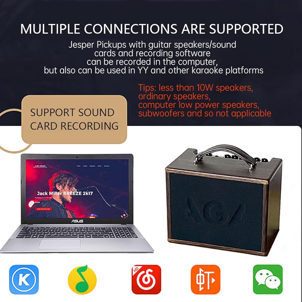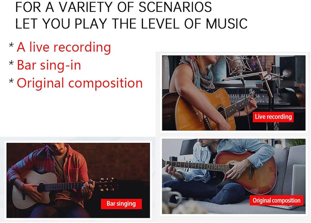 【التقاط سلبي وتقليل الضوضاء】التقاط سلبي للجيتار (لا يحتاج إلى بطارية). يستخدم المجال المغناطيسي لجمع اهتزاز الخيط وتمريره إلى مكبر الصوت، والذي لا يتأثر بالبيئة الخارجية بحيث يقلل الضوضاء بشكل فعال (غير متوفر للقيثارة والجيتار الكلاسيكي).