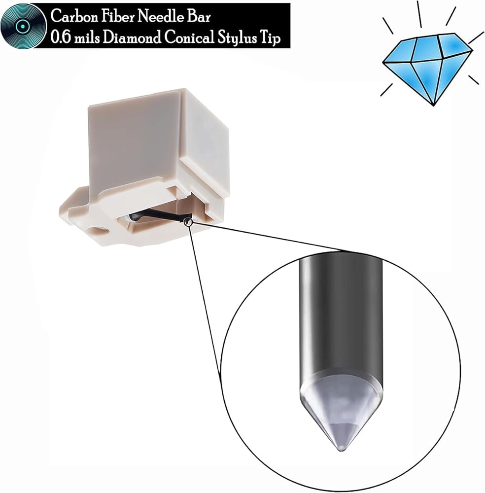 【Diamond Stylus Tip】 - ✔This record player needle comes with 0.6 mils conical diamond stylus tip and guard cover to protect it, plus the needle bar is made of high-quality carbon fiber material, which ensures accurate tracking function and continues to read groove signals with a high degree of precision, provide excellent music detail and sound quality.