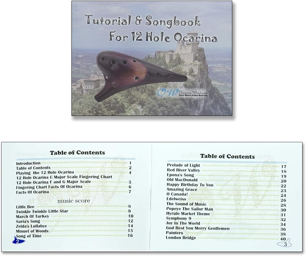 تحمي الحقيبة الواقية الأوكارينا من التلف. أدنى ملاحظة لأصابع C هي La. للأغاني ذات الأقل ملاحظة من La، ستحتاج إلى التبديل إلى إصبع F أو G. يُعلمك الكتاب كيف تلعب 3 أصابع مختلفة.