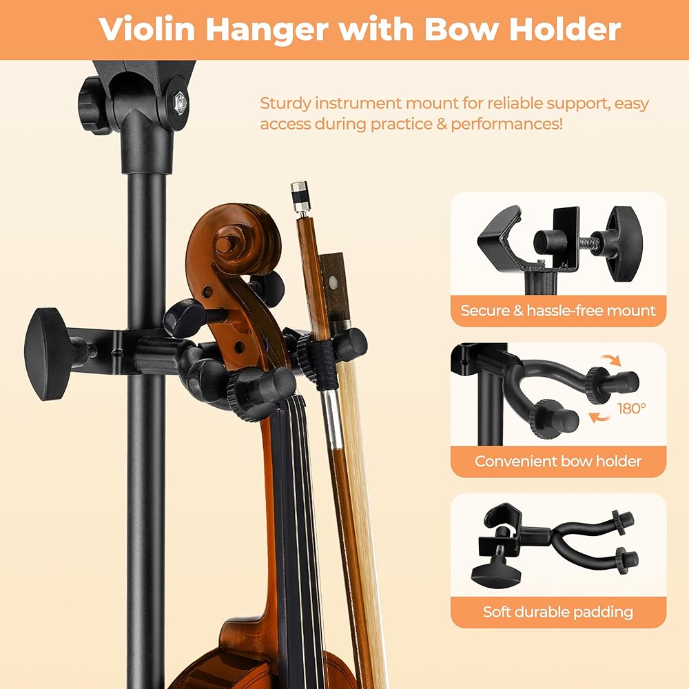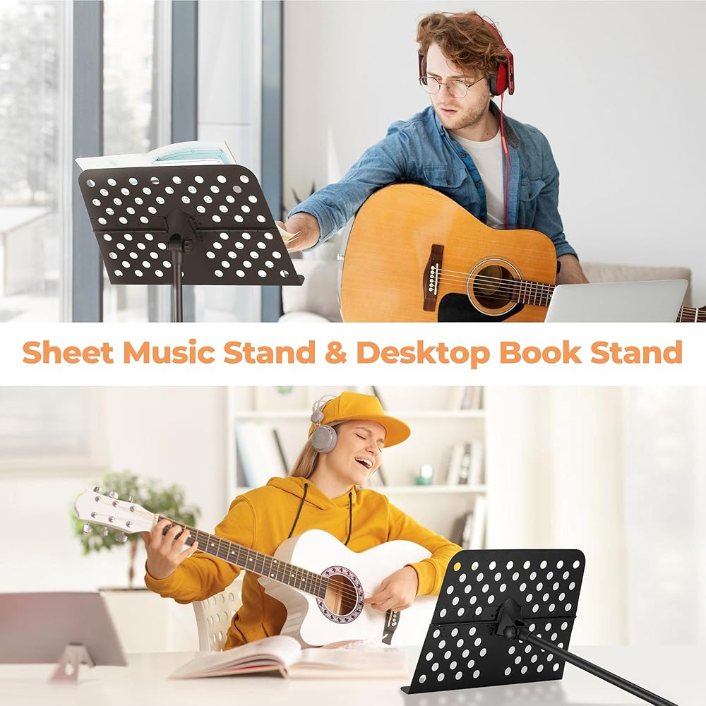 ✔ [Stable Structure] - With the triangle structure and adjustable knob in the back, the music stand can support the sheet music firmly. With 46.5 cm(long) and 28 cm(wide) bookplate, the music stand can hold A4 or paper books and documents with ease. Two metal spring arms keep your music sheets or book in place so that you can read music sheet or recipes and has your hands free whilst playing guitar or cooking!