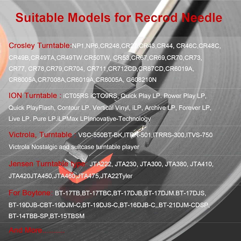• Ruby Record player needle:Suitable for most models on the market, such as Crosley, ION, Victrola, 1byone, Jenson, Innovative Technology, Boytone, TechPlay, Capehart and more...