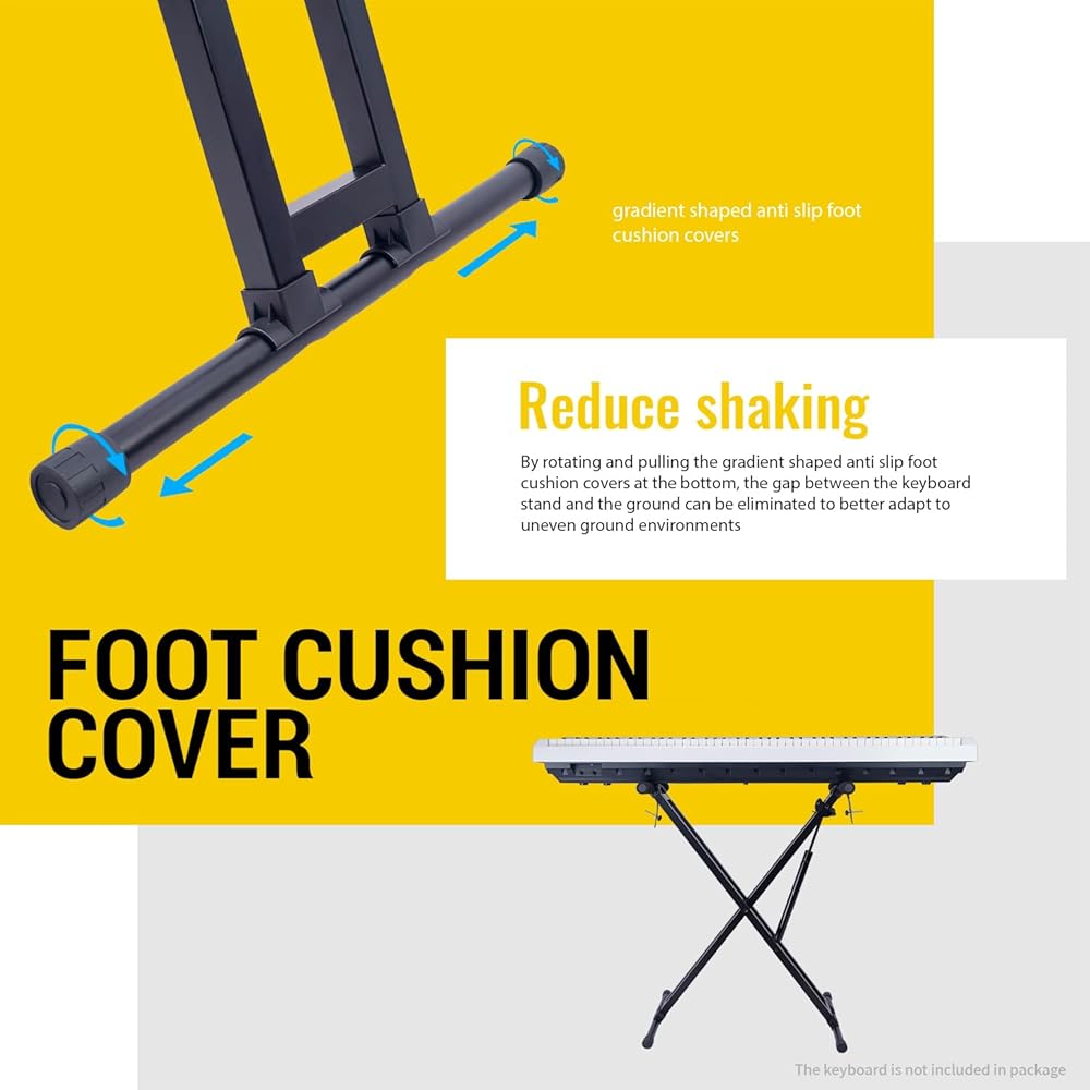 وسادة قدم هادئة وحصيرة مضادة للانزلاق: الحامل مجهز بوسادة قدم هادئة لتقليل أي ضوضاء أو اهتزاز غير مرغوب فيه أثناء أدائك. توفر السجادة المطاطية المضادة للانزلاق حماية لطيفة للوحة المفاتيح الخاصة بك، مما يمنعها من الانزلاق أو الخدش.
