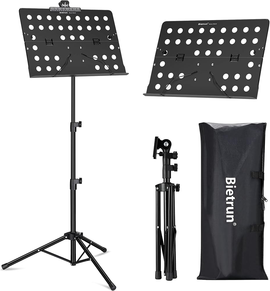بيترون حامل موسيقى معدني محمول مع حقيبة حمل وارتفاع وزاوية قابلة للتعديل وحامل كتب موسيقية قابل للطي ومشبك ورقة موسيقية للكمان وعازفي الجيتار والفرقة الموسيقية