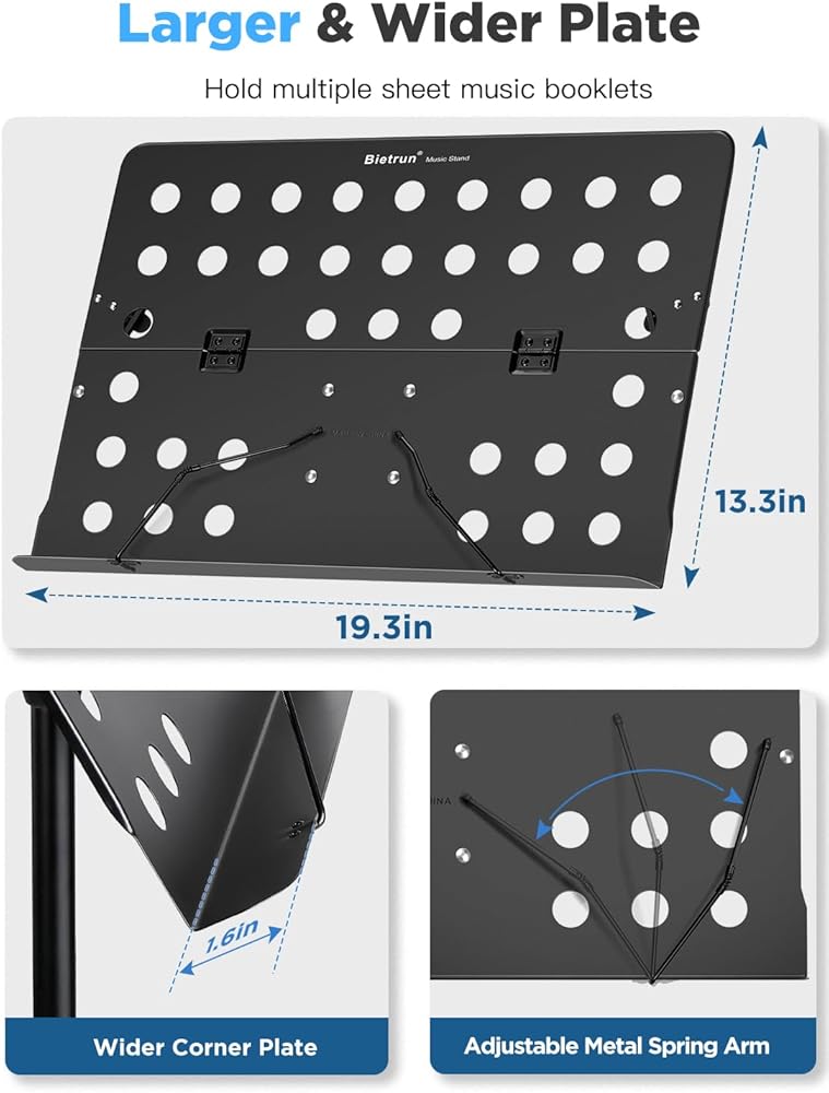 【زاوية قابلة للتعديل】يمكن إمالة صينية الموسيقى لحامل الموسيقى حتى 180 درجة، مما يلبي احتياجاتك في المناسبات المختلفة. صينية بعمق 1.6 انش تكفي لحمل أي نوع من أوراق الموسيقى أو الكتب. يمكن لوصلات الذراع الزنبركية المعدنية تثبيت أوراق الموسيقى وكتاب الأغاني بأمان في مكانها.