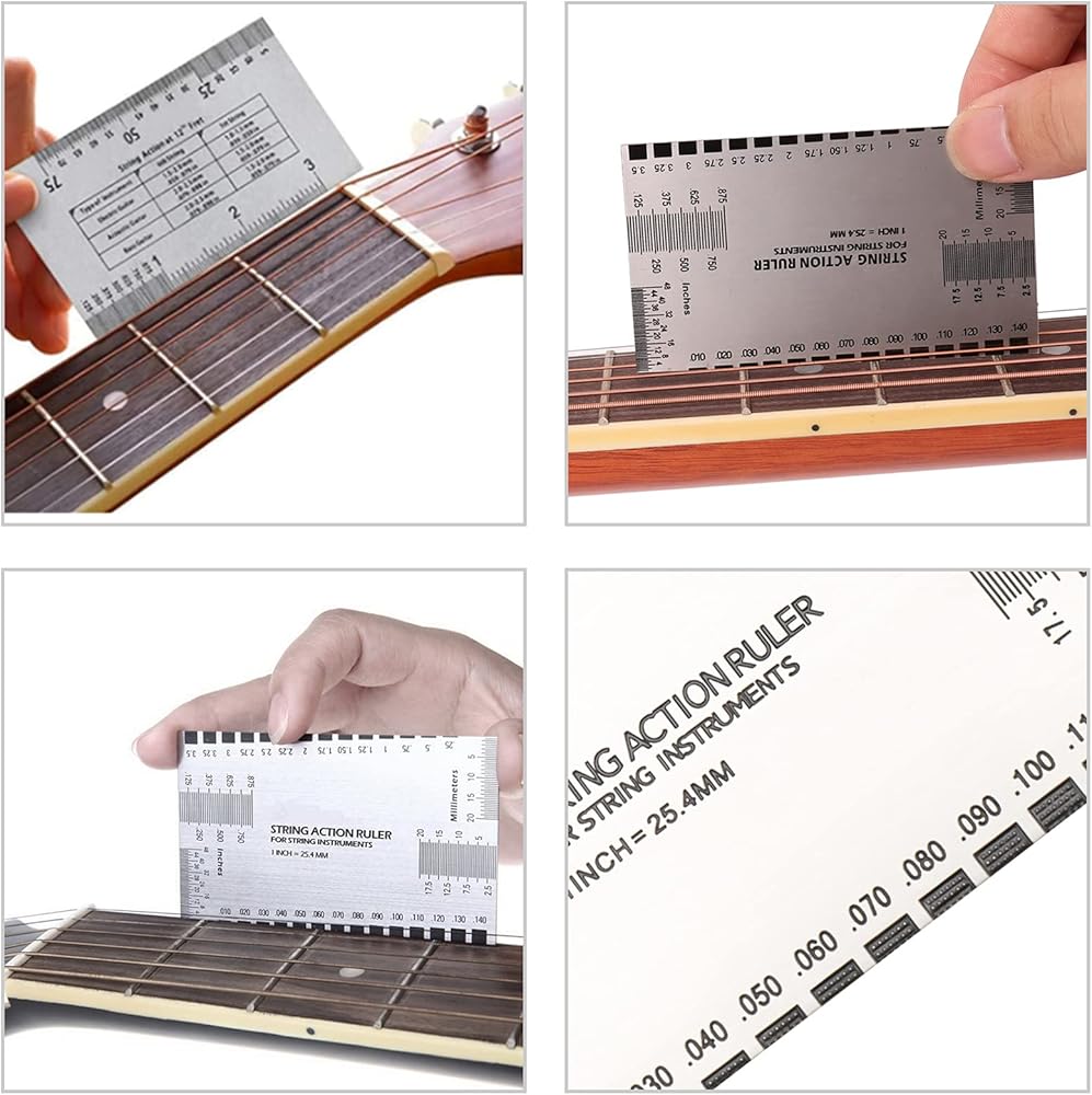 من الفولاذ المقاوم للصدأ، وحدتين مطبوعتين بما في ذلك الإنش والمليمتر، قياس دقيق لمسافة الخيط، ارتفاع السرج وعمقه للجسر، عمق أخدود الحبل.