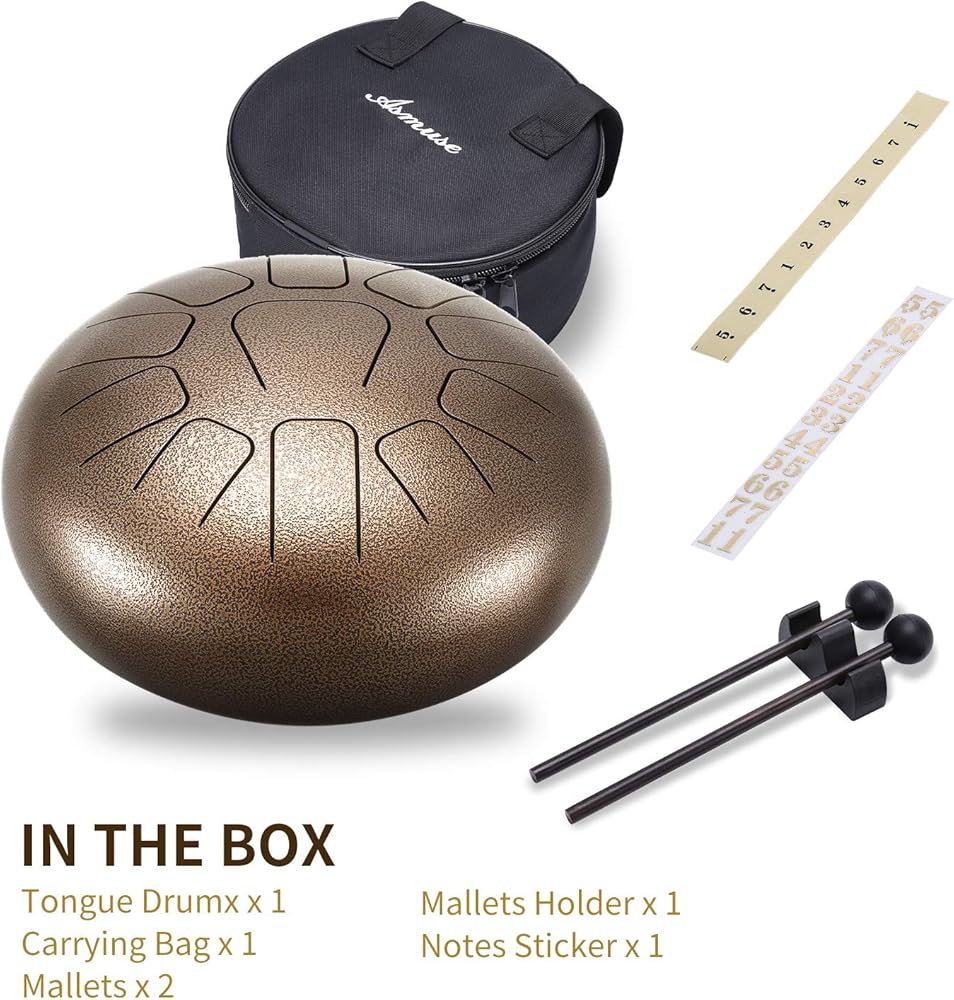 ♫ تتضمن مجموعة اللسان: ما تحصل عليه من حزمة طبلة اللسان الفولاذية تتضمن: 1 × طبلة لسان فولاذية، 2 زوج من المطارق، 1 × دعامة مطرقة، 1 × ملصق منشط، 1 × حقيبة سفر من النايلون، 1 × تعليمات وكتاب أغاني.