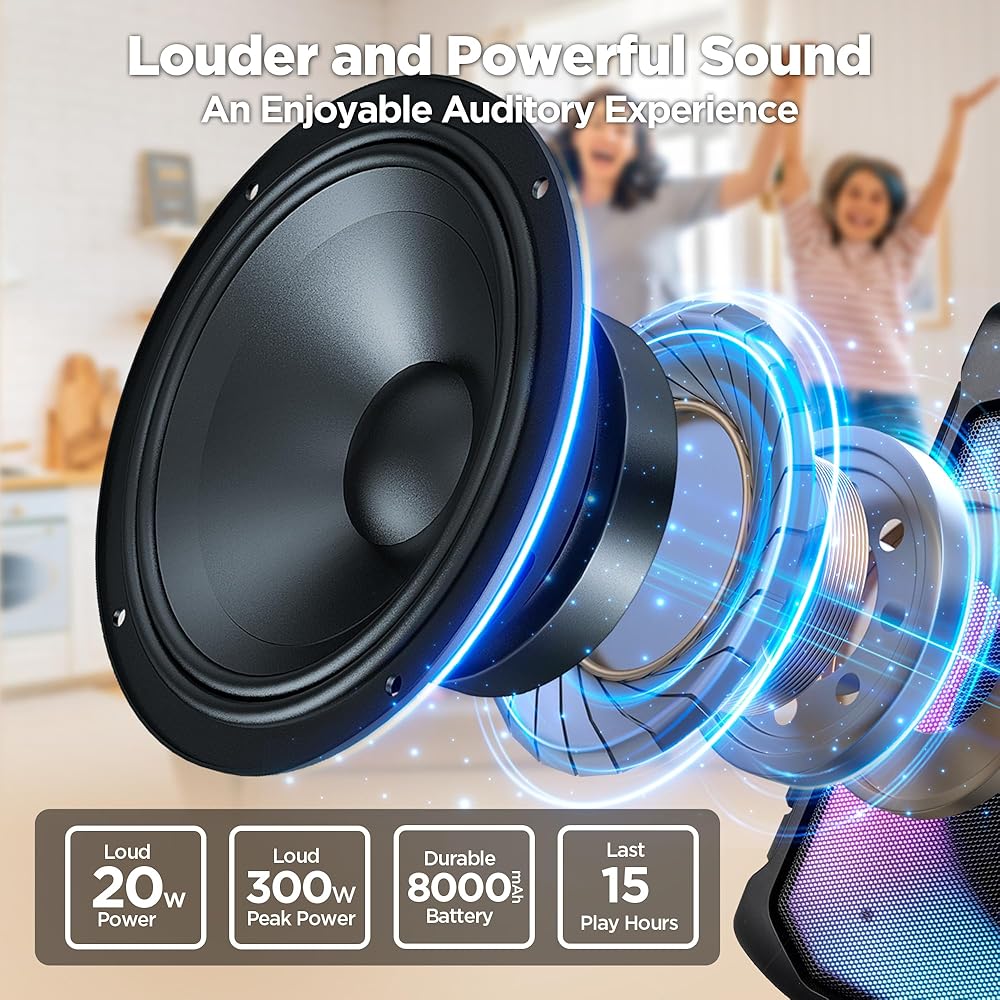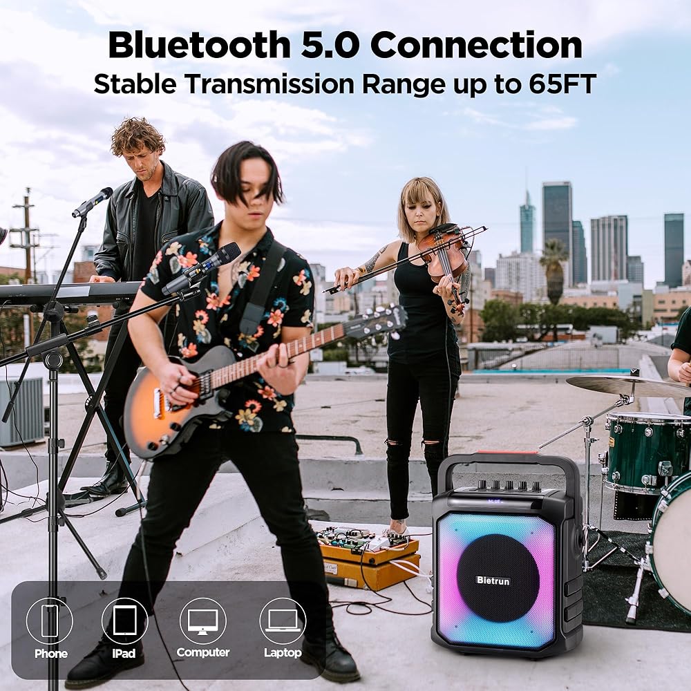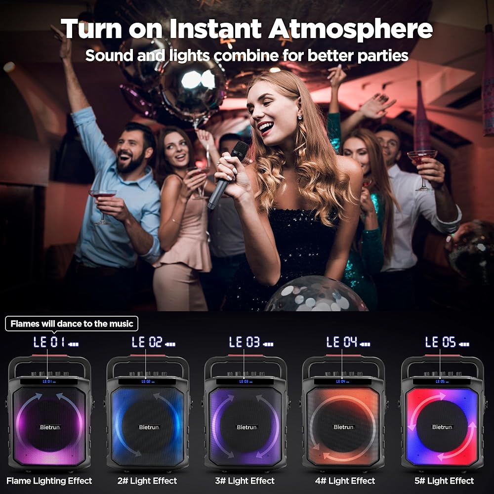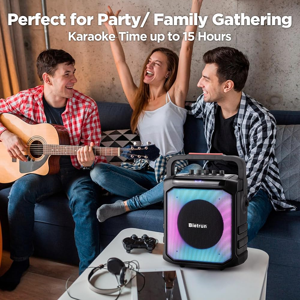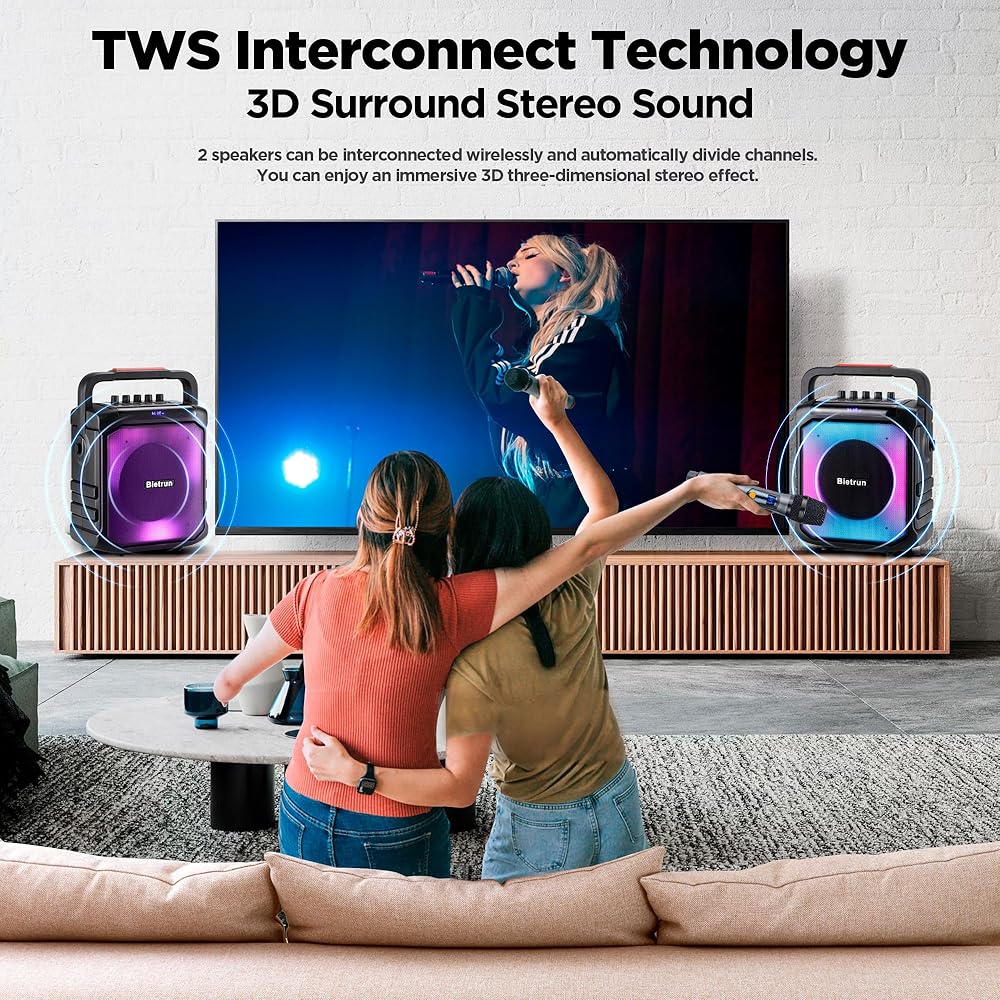 [TWS]: ● تحتوي آلة Bietrun Karaoke على وظيفة TWS التي يمكن توصيلها بسماعة أخرى لتكوين نظام كاريوكي مزدوج السماعات، وسيشكل الصوت استريو وستتم مزامنته ويجعلك محاطًا بقناتين.