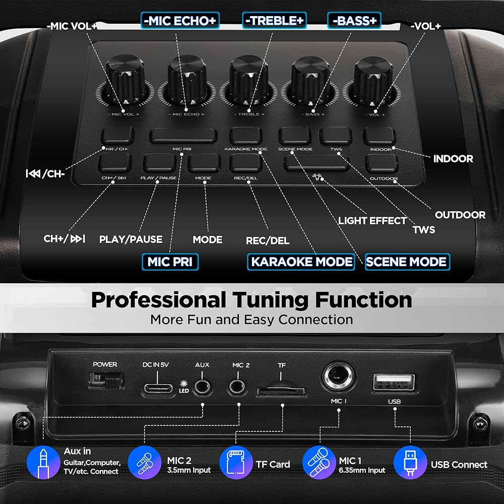 [آلة كاريوكي متعددة الوظائف]: تدعم آلة الكاريوكي هذه بطاقات Micro TF، USB، AUX 1/8 بوصة، ميكروفون 1/8 بوصة، مدخل ميكروفون 1/4 بوصة متوافق مع الهواتف الذكية، والأجهزة اللوحية، وأجهزة الكمبيوتر المحمولة، وأجهزة iPhone، وأجهزة iPad، أجهزة التلفاز، وأكثر من ذلك. ●يمكن التحكم في المزيد من الميزات عن طريق الأزرار الموجودة أعلى جهاز الكاريوكي أو جهاز التحكم عن بعد.