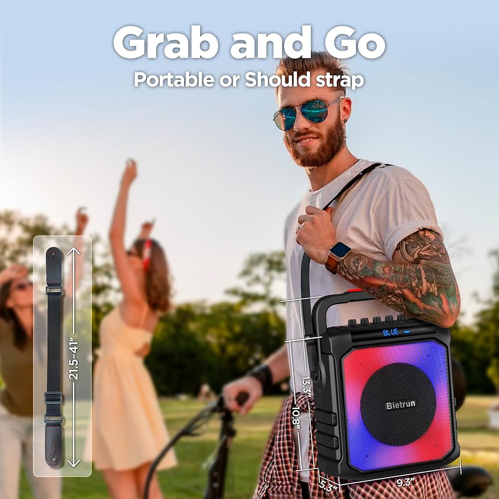 [تصميم محمول]: حجم آلة الكاريوكي بلوتوث: الطول 9.3 بوصة (23.62 سم) × العرض 5.3 بوصة (13.46 سم) الارتفاع 10.8 بوصة (27.43 سم)، الوزن: 5.9 رطل (2.68 كجم). إنه مدمج وخفيف الوزن، مما يجعل من السهل حمله. يجب أن يأتي مع حزام قابل للفصل يصل طوله إلى 41 بوصة (1.04 م). يمكنك إحضار مكبر الصوت معك بسهولة.