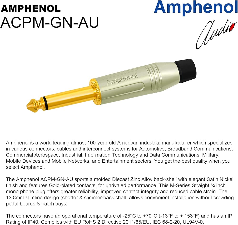 Amphenol ACPM-RN-AU & ACPM-GN-AU sports a molded metal back-shell with elegant Satin finish and features Gold-plated contacts, for unrivalled performance. These M-Series ¼ inch mono phone plugs offer greater reliability, improved contact integrity and reduced cable strain. The slimline design (shorter & slimmer back shell) allows convenient installation without crowding pedal boards & patch bays.