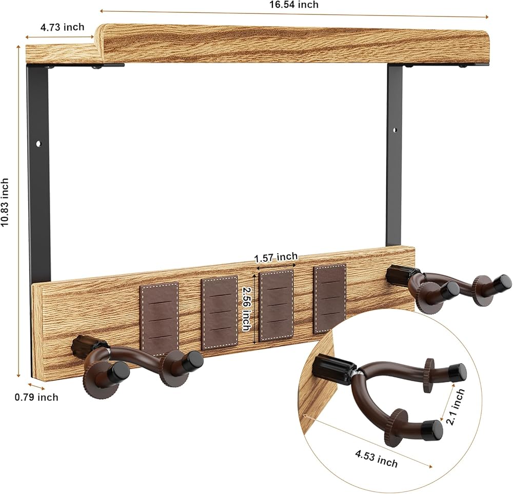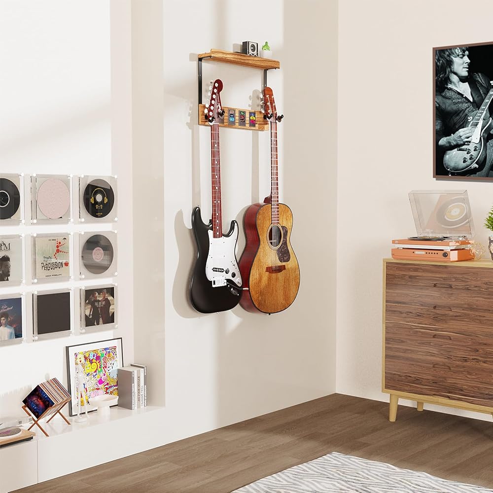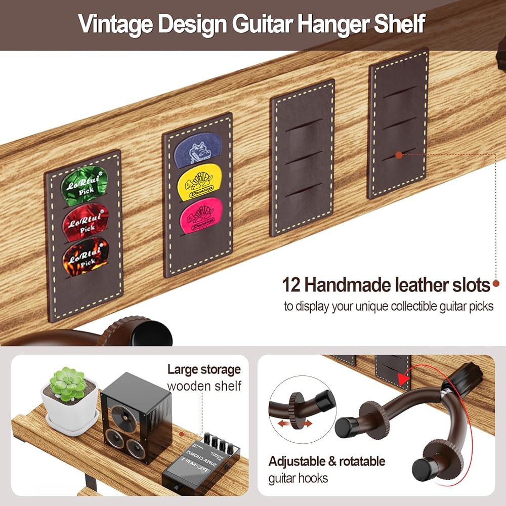 🎸 رف حامل جيتار خشبي ذو سعة كبيرة: حامل الحائط على الجيتار مع رف تخزين خشبي ذو سعة كبيرة يحمل العديد من ملحقات الجيتار مثل الأشرطة وأغطية الأوتار والموالفات للحفاظ على كل شيء منظمًا وفي متناول اليد.