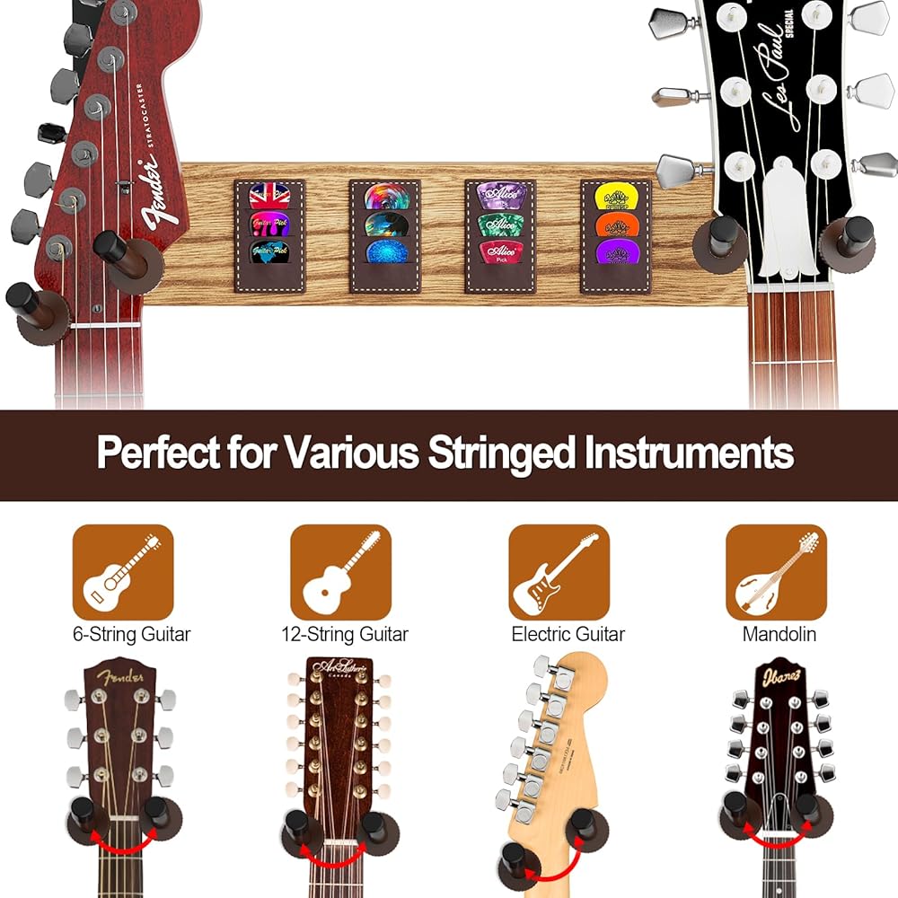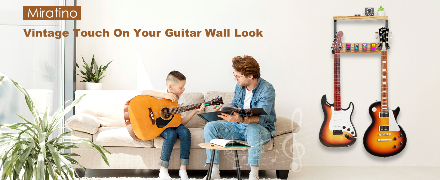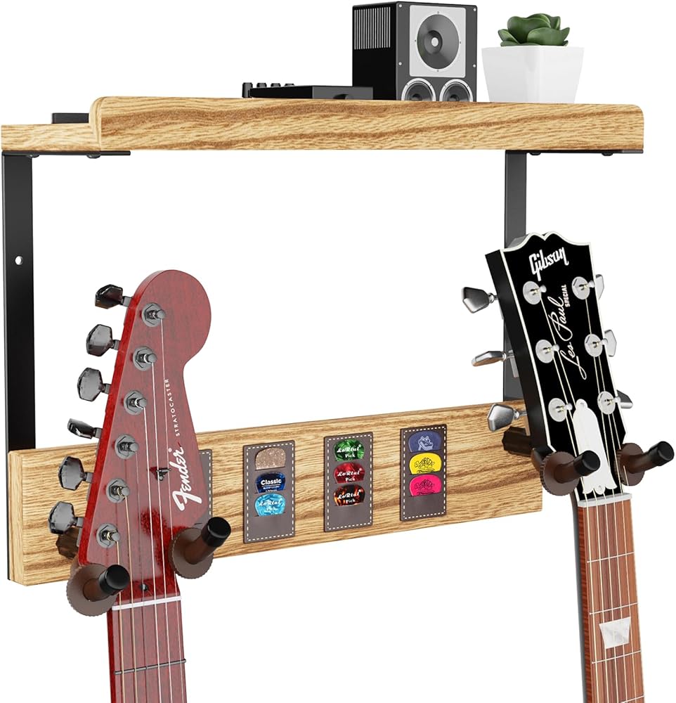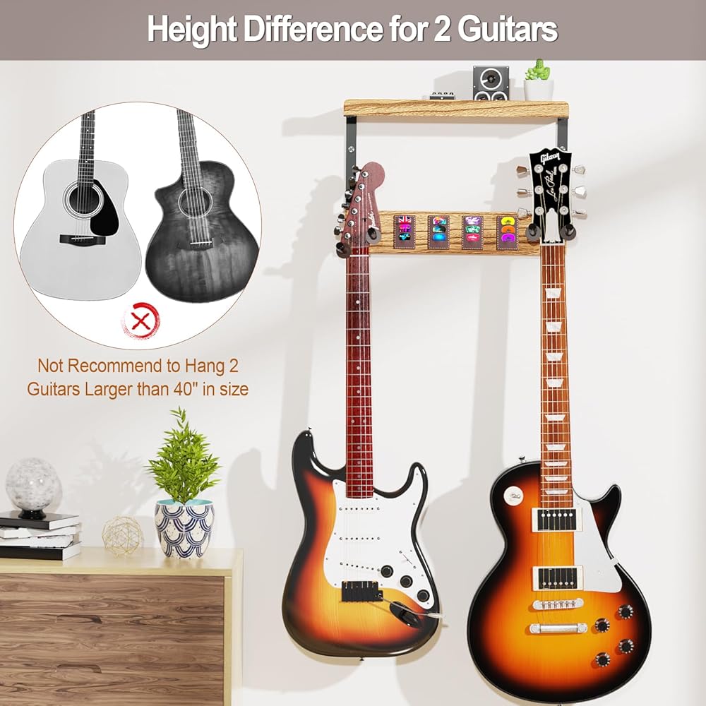 🎸 رف حامل جيتار خشبي ذو سعة كبيرة: حامل الحائط على الجيتار مع رف تخزين خشبي ذو سعة كبيرة يحمل العديد من ملحقات الجيتار مثل الأشرطة وأغطية الأوتار والموالفات للحفاظ على كل شيء منظمًا وفي متناول اليد.
