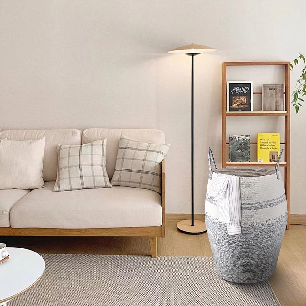 البيئة القابلة للتطبيق: تتميز سلال التخزين الكبيرة بتصميم كلاسيكي وأنماط أنيقة وبسيطة تجعلها تضيف لمسة جميلة إلى أي ديكور أو أثاث غرفة - سلة الغسيل المنسوجة الأنيقة تستخدم كديكور منزلي وحاوية تخزين لغرفة نومك والحمام وسلال الغسيل وتخزين الألعاب.