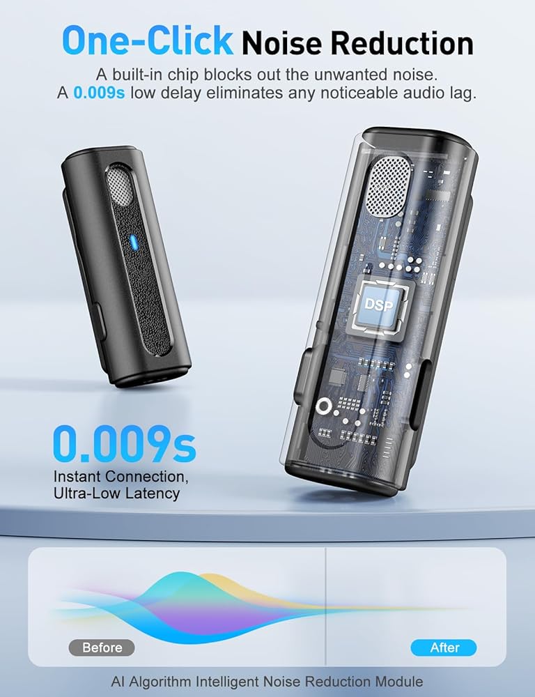 تأثير ممتاز لتقليل الضوضاء - يلتقط هذا الميكروفون Lavalier الأصوات من 360 درجة ويوفر جودة صوت استثنائية. قم بتصفية الضوضاء لاستعادة الأصوات البشرية في البيئات الصاخبة، وذلك بفضل وحدة تقليل الضوضاء الذكية لخوارزمية الذكاء الاصطناعي والقدرة الرائعة على مكافحة التداخل.
