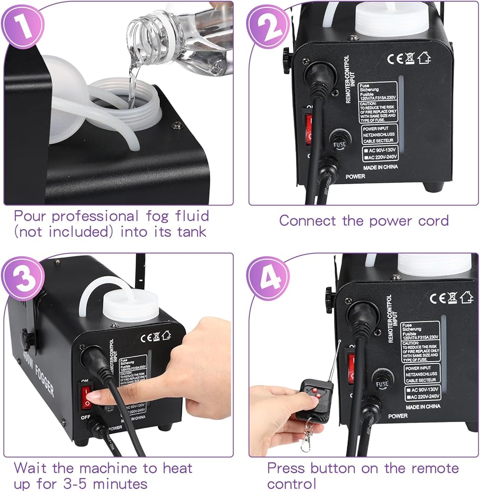 سهلة التشغيل باستخدام جهاز التحكم عن بعد: مع جهاز تحكم عن بعد مريح، فإن تشغيل آلة الضباب هذه سهل؛ بغض النظر عن مكان وجودك في الغرفة، يمكنك ضبط إخراج الضباب والتحكم في الأضواء وتشغيل الجهاز وإيقاف تشغيله