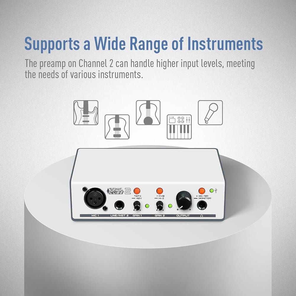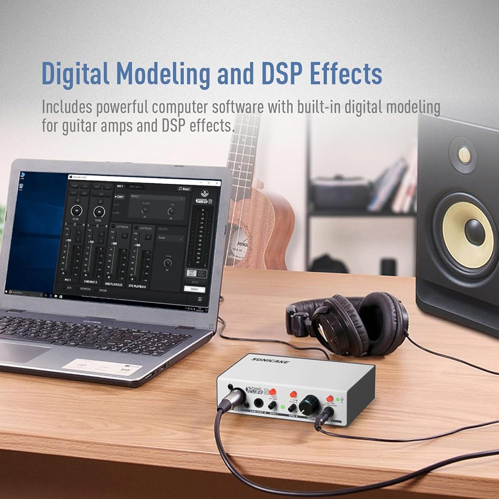 Sonicake Sonic Cube II - خلاط واجهة الصوت USB مع النمذجة الرقمية وتأثيرات DSP للتسجيل والبث والبودكاست ، 48 فولت Power Power Dual -channel Preamp مع مدخلات XLR والخط