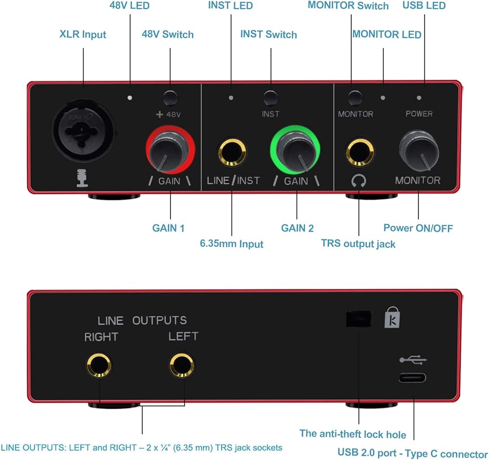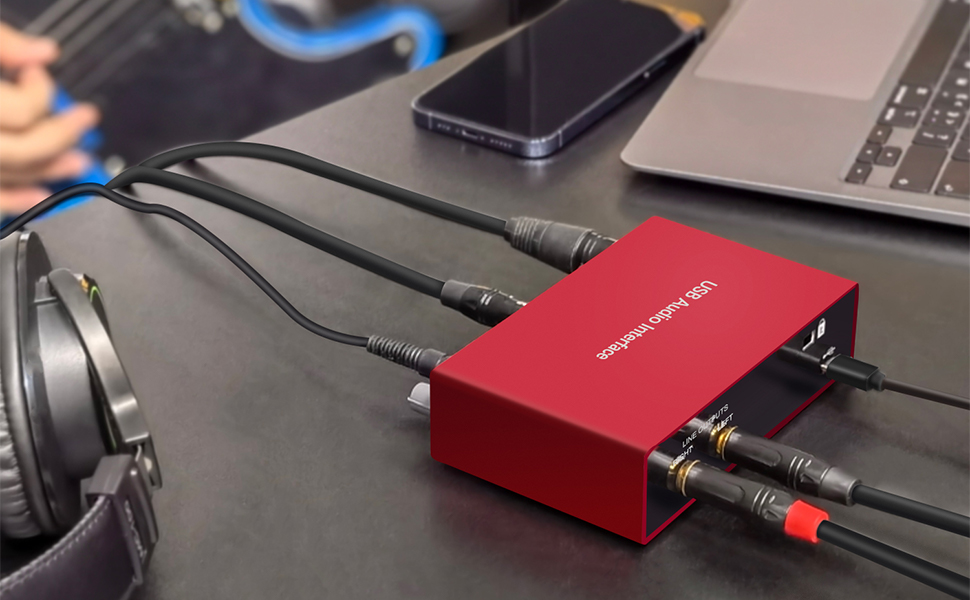 واجهة صوت USB، واجهة صوت اكس ال ار 48 فولت طاقة فانتوم، تدعم الجيتار، برامج مجمعة بدون تحميل متوافقة مع معظم دي ايه دبليو (واجهة صوت مع كيبل اكس ال ار)