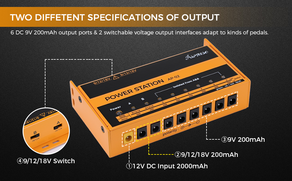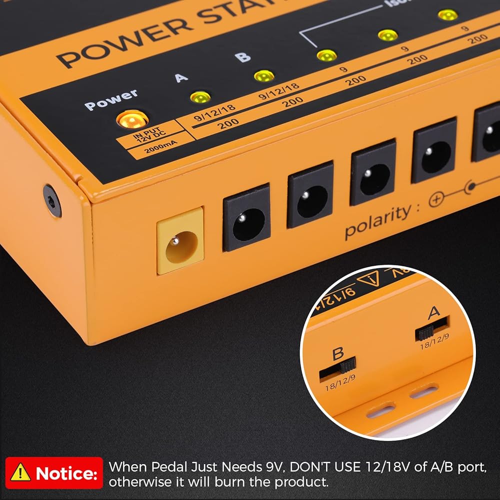 🎸【 8 Isolated DC Outputs】With 8 Individual Outputs: 9V 200mAh port x 6, 9/12/18V 200mA adjustable output port x 2 (A/B port). Our package has 2pcs 1 to 2 DC connection cables,using them you can connected to 10 effect pedals, but need adjust the voltage of the A and B output to 18V.