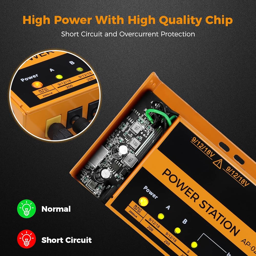🎸【 LED Indicator Light 】Each output DC output has a LED indicator light. Green Light for Normal Working, Red Light for Fault Status.