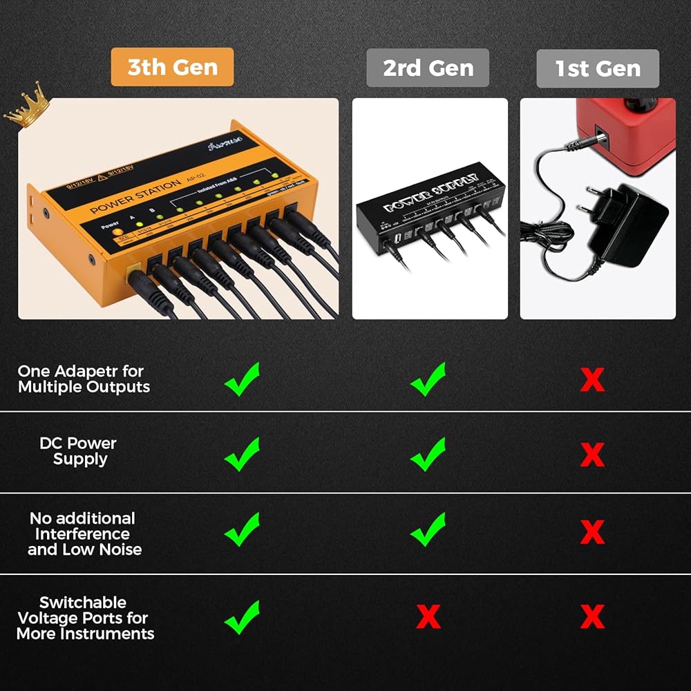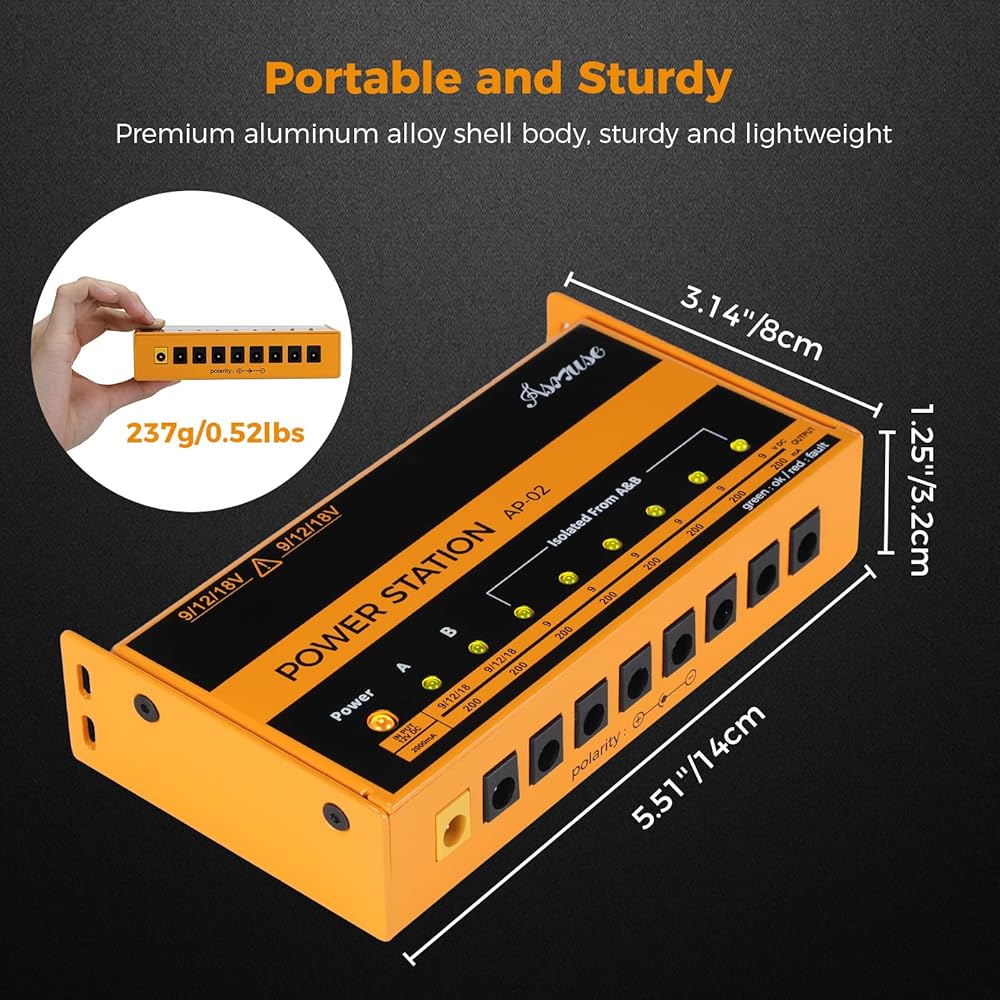 🎸【 Package List 】Guitar Pedal Board Power Adaptor x 1, 1 to 1 DC Cable x 8, 1 to 2 DC Cable x 2, User Manual x 1. The Adaptor adopt high-quality heat-dissipating aluminum alloy materials, carefully selected IC chips, which generate less heat.