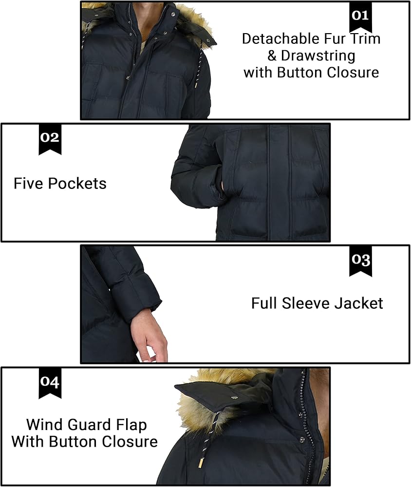 • Design: Classic Hooded jacket with detachable hood with detachable fur Trim & drawstring & button closure for full neck coverage. It has a full-length zipper closure, a Wind guard flap with button closure, and hidden ribbed sleeve cuffs.