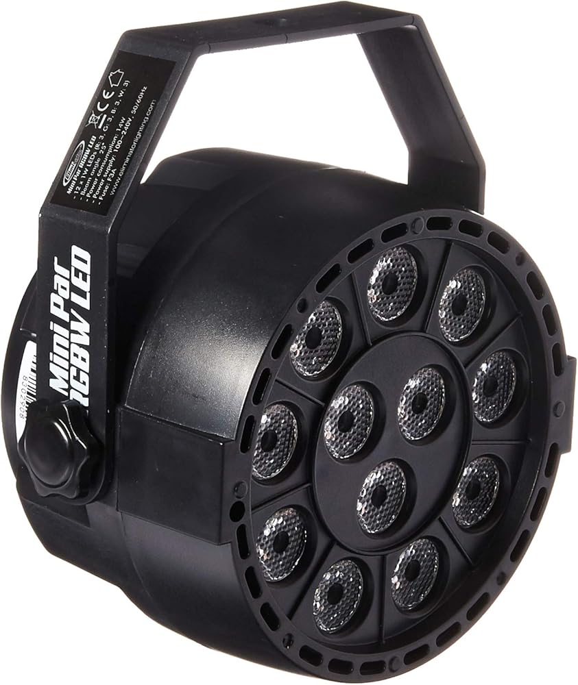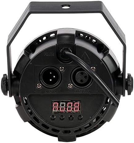 العناصر المتضمنة: توفر هذه التركيبة اثني عشر مصباح LED بقدرة 1 وات (أحمر 3، أخضر 3، أزرق 3، أبيض 3)، تصميم علبة بلاستيكية مدمجة، ودعامة تعليق، 3 دبابيس DMX In/Out لتوصيل تركيبات متعددة معًا، و4 أزرار عرض رقمي.