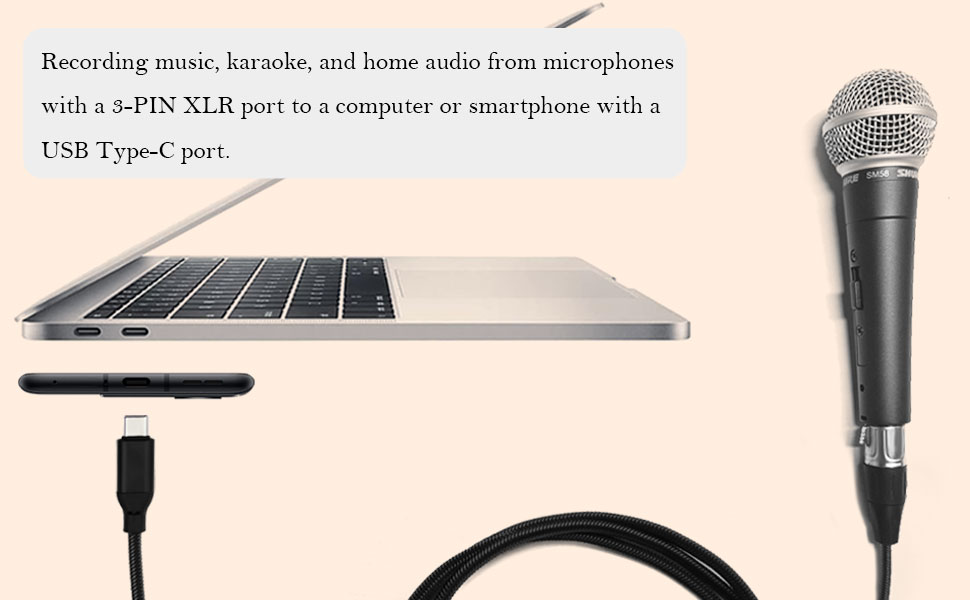 • [التوصيل والتشغيل] باستخدام كابل الميكروفون USB-C إلى XLR، أدخل قابس أنثى XLR في الميكروفون، وموصل USB-C في الهاتف الخلوي أو الكمبيوتر المحمول، وهو ملائم للتسجيل أو إدخال الصوت الآخر. لا توجد حاجة إلى أجهزة تشغيل أو برامج تشغيل أخرى، قم بالتوصيل والتشغيل. (ملاحظة: هذا الكابل عبارة عن نقل أحادي الاتجاه، ويمكنه إدخال الصوت فقط من موصل XLR والإخراج من موصل Type-C.)