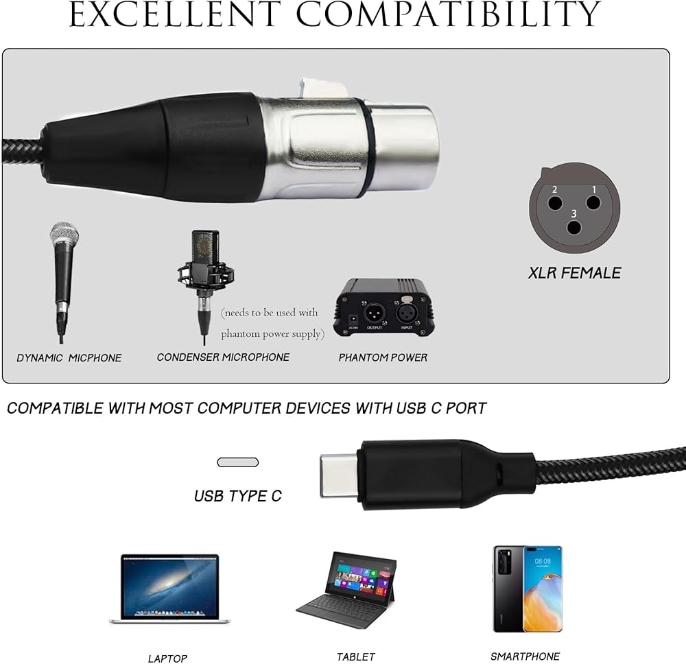 • [توافق ممتاز] 1) كابل أنثى من النوع C إلى XLR متوافق مع معظم الهواتف المحمولة وأجهزة الكمبيوتر المحمولة وأجهزة الكمبيوتر والأجهزة الأخرى ذات منافذ USB C، مثل ماك بوك؛ 2) متوافق مع معظم برامج التسجيل: GarageBand/Guitar Combo Amps/Audacity/Amplitude. 3) متوافق مع Yousician. (ملاحظة: غير متوافق مع XBOX/ PS وأي أجهزة ألعاب.)