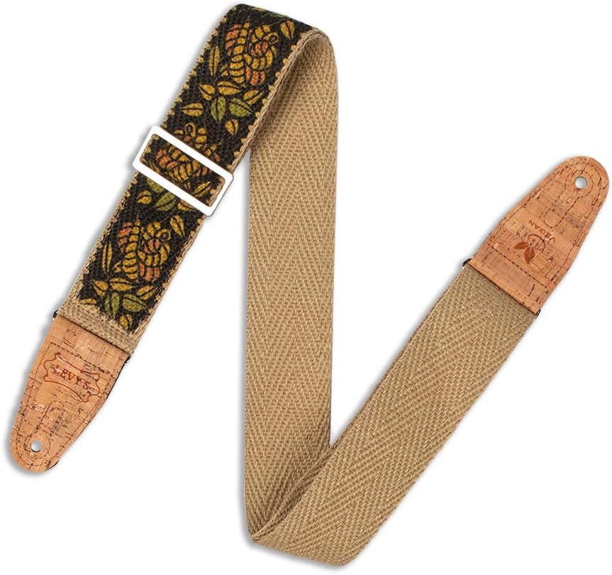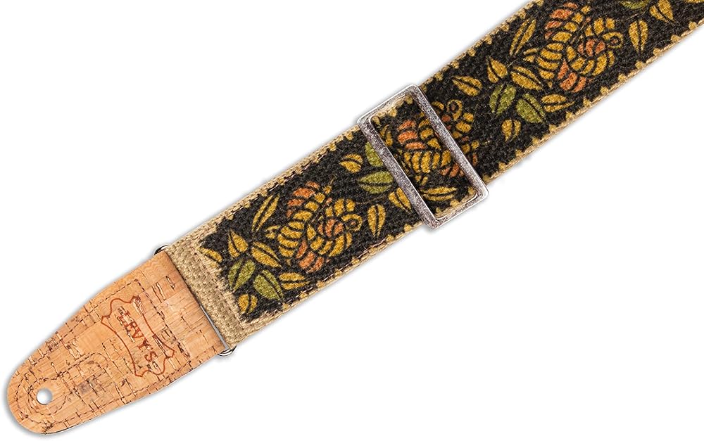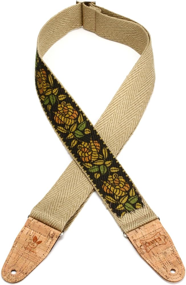 حزام غيتار Levy's Hemp "نباتي" مقاس 2 بوصة مع زخرفة التوت والرمادي الداكن على حزام من القنب الطبيعي مع نهايات من الفلين مكونة من طبقتين.