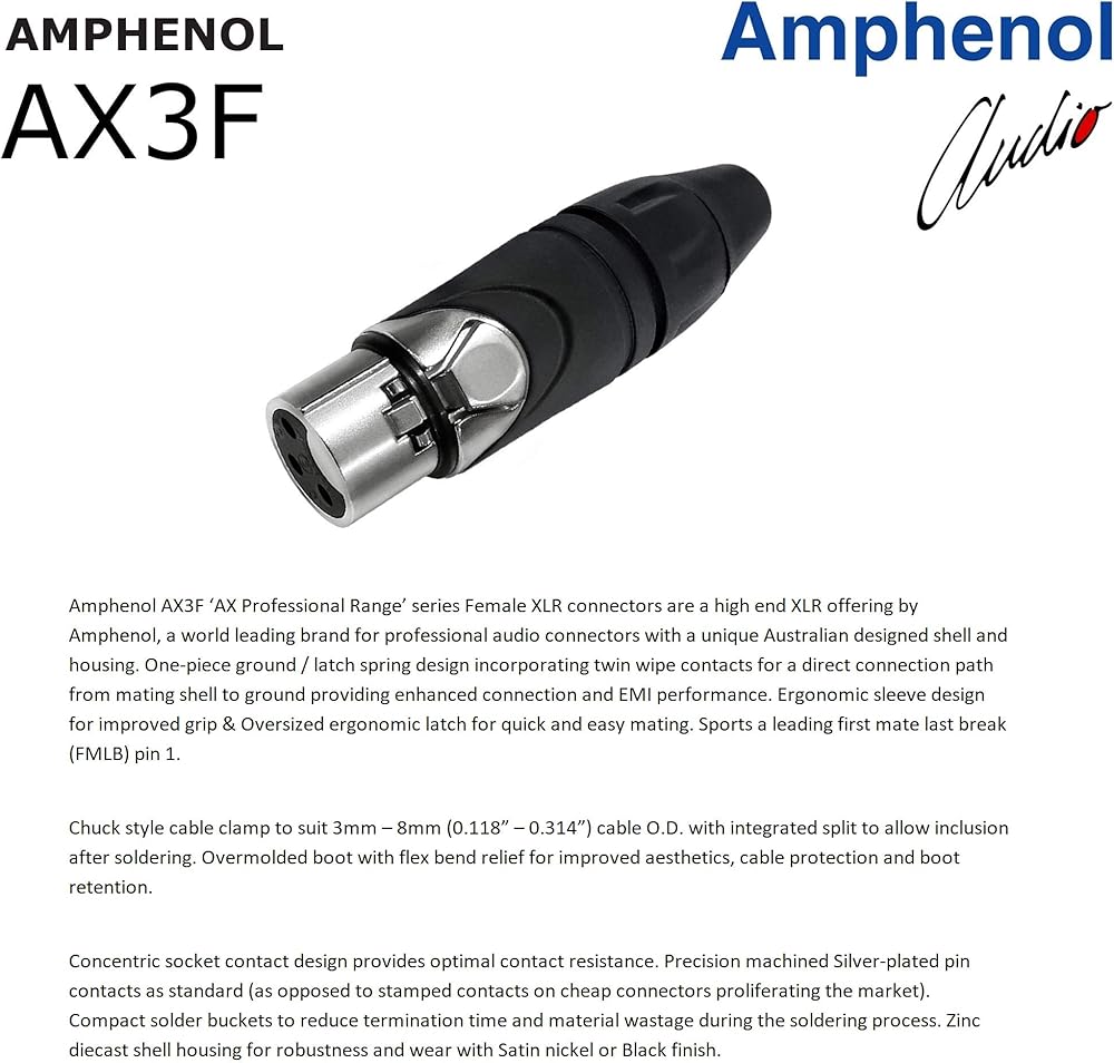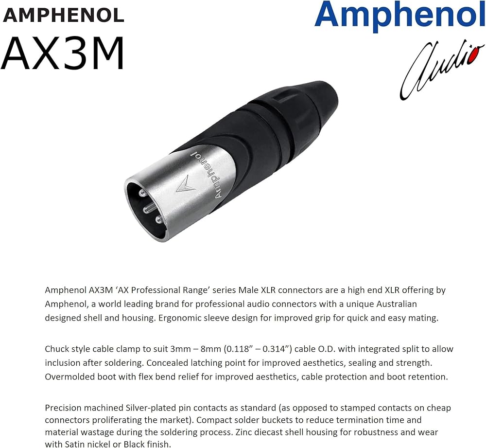 AX3M وAX3F هي عروض اكس ال ار عالية الجودة من امفينول، تتميز سلسلة ايه اكس (الاحترافية) بموثوقية كبيرة وسلامة اتصال محسنة وتقليل إجهاد الكيبل. تأتي الموصلات في هيكل مصبوب من الزنك المطلي بالنيكل اللامع ولها وصلات مطلية بالفضة لأداء فائق (على عكس الوصلات المختومة على الموصلات الرخيصة التي تنتشر في السوق).