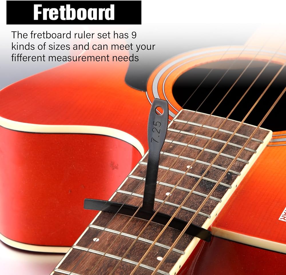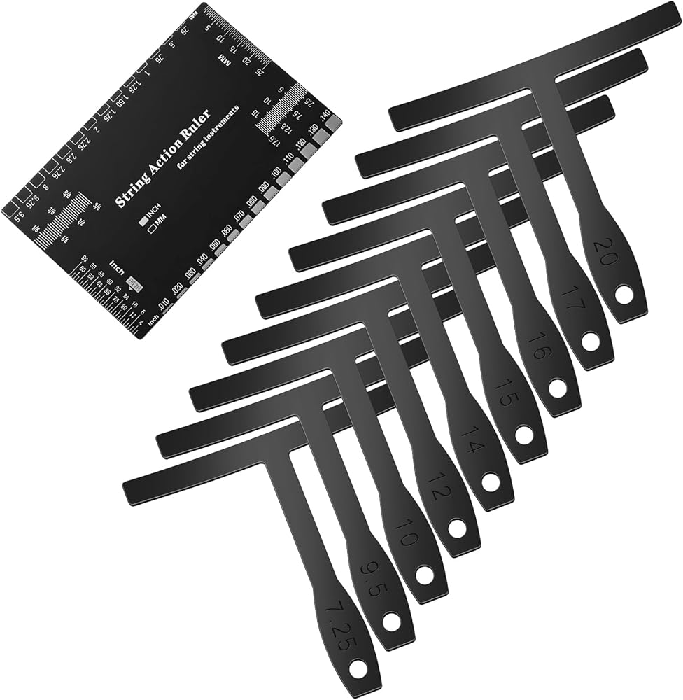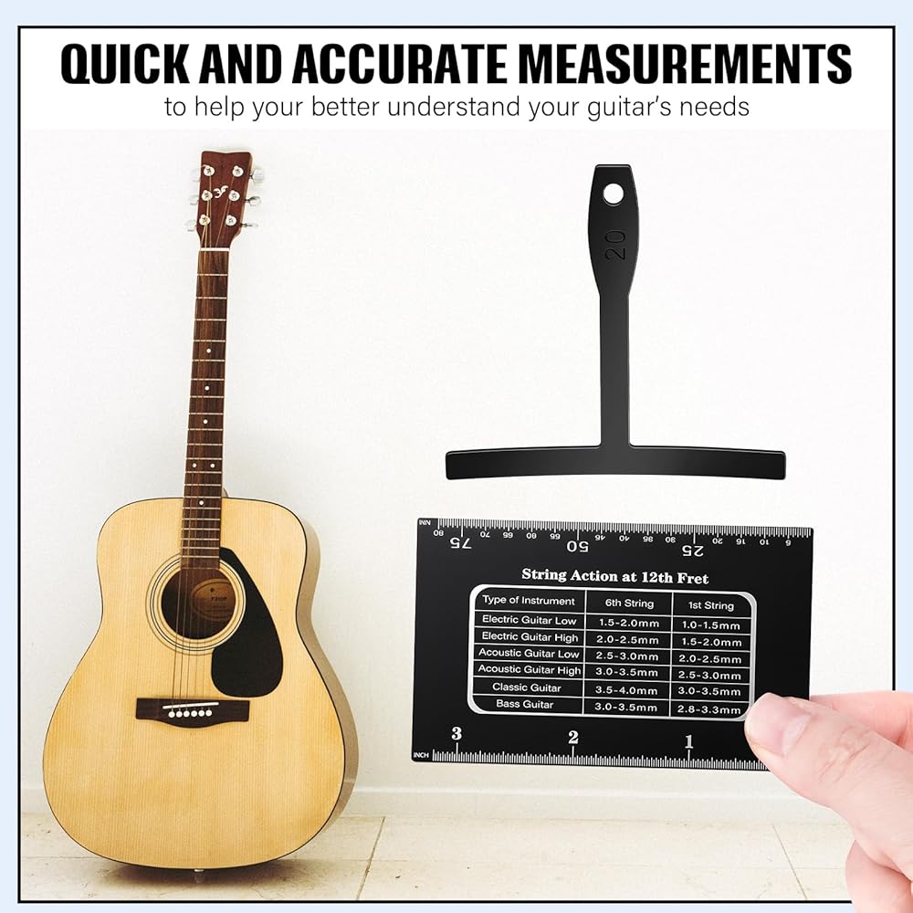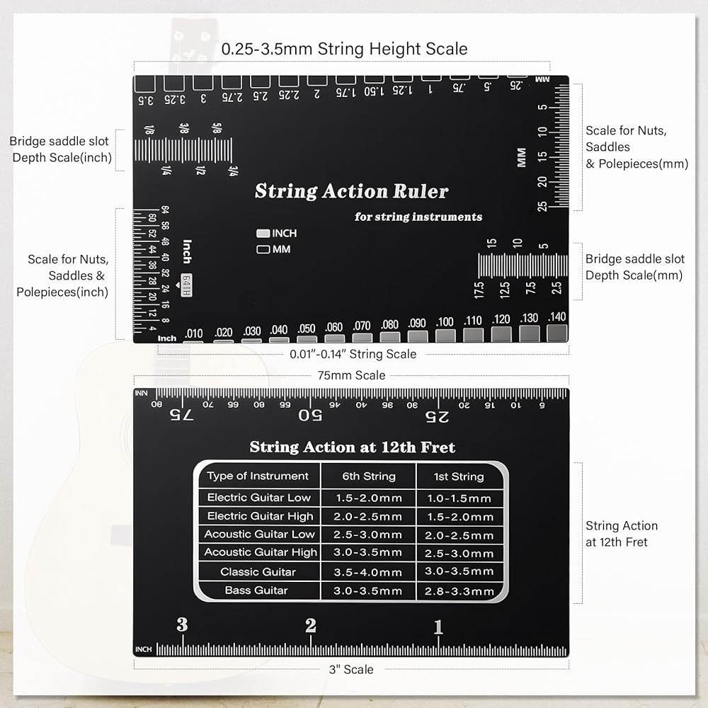 مجموعة أدوات الغيتار الأكثر لمعانًا: تتضمن مجموعة الأدوات اللامعة هذه 9 مقاييس نصف قطرها أسفل الوتر ومسطرة حركة وتر مزدوجة الجانب، شاملة لإعداد الجيتار الخاص بك، مريحة للحمل والتخزين