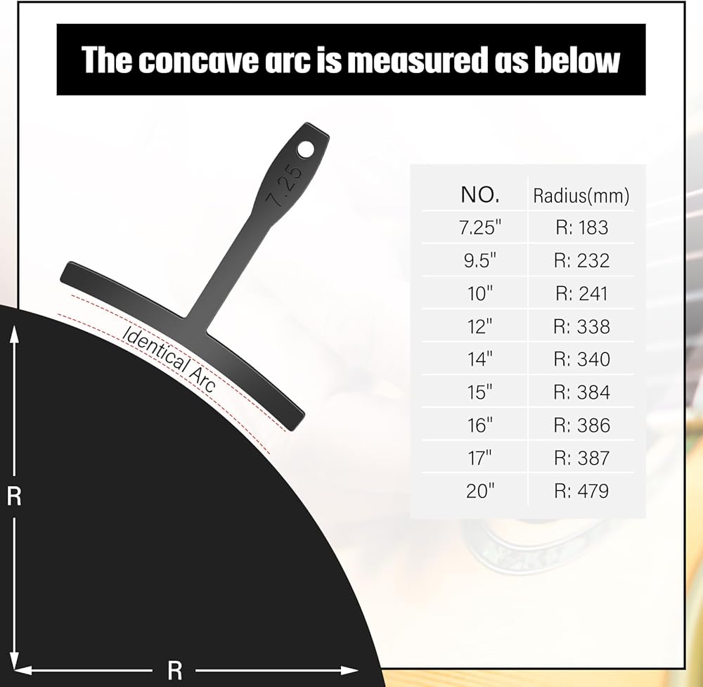 مقياس نصف قطر الوتر: يأتي بمقاسات 7.25/ 9.5/ 10/ 12/ 14/ 15/ 16/ 17/ 20 انش، لوحة الفريتس تقاس بالراديان، وراديان لضبط رمز البيانو الأوتار، والحصول على قياسات دقيقة لنصف قطر لوحة الفريتس الخاص بأداتك ونصف قطر السرج ونصف قطر الصامولة من سطح نصف القطر العلوي أو السفلي