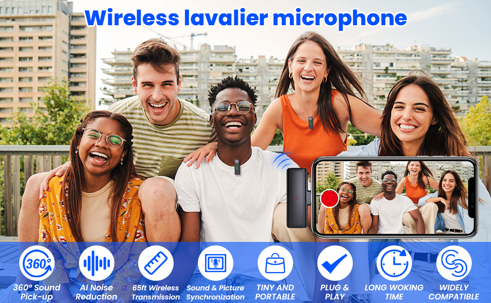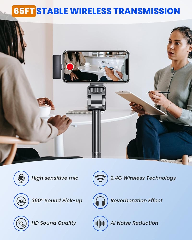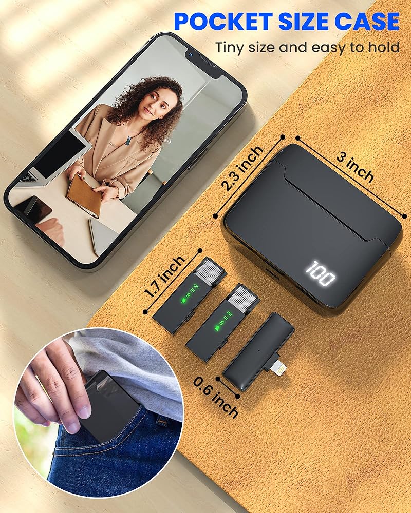 【تأخير منخفض وتقليل الضوضاء: 】 الميكروفون اللاسلكي لجهاز iphone المزود بشريحة 2.4 جيجا، والتي تحتوي على زمن انتقال يبلغ 0.025 ثانية فقط وتحافظ على الصوت بعد الصورة في الوقت الفعلي. التقاط الصوت بزاوية 360 درجة ووضع تقليل الضوضاء بمفتاح واحد يحافظ على الصوت واضحًا دون تشويه