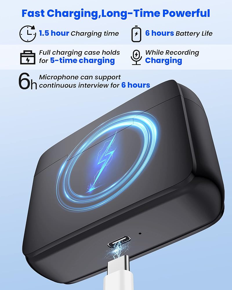 【حقيبة شحن لاسلكية قوية ومحمولة】يمكن لعلبة الشحن تخزين وشحن جهاز الإرسال. عندما تقوم بشحن الصندوق بالكامل، يمكنه شحن جهاز الإرسال بالكامل حتى 5 مرات والتأكد من عمل جهاز الإرسال لمدة 6 ساعات تقريبًا. تصميم خفيف الوزن ومحمول، استمتع بتجربة التسجيل المحمولة