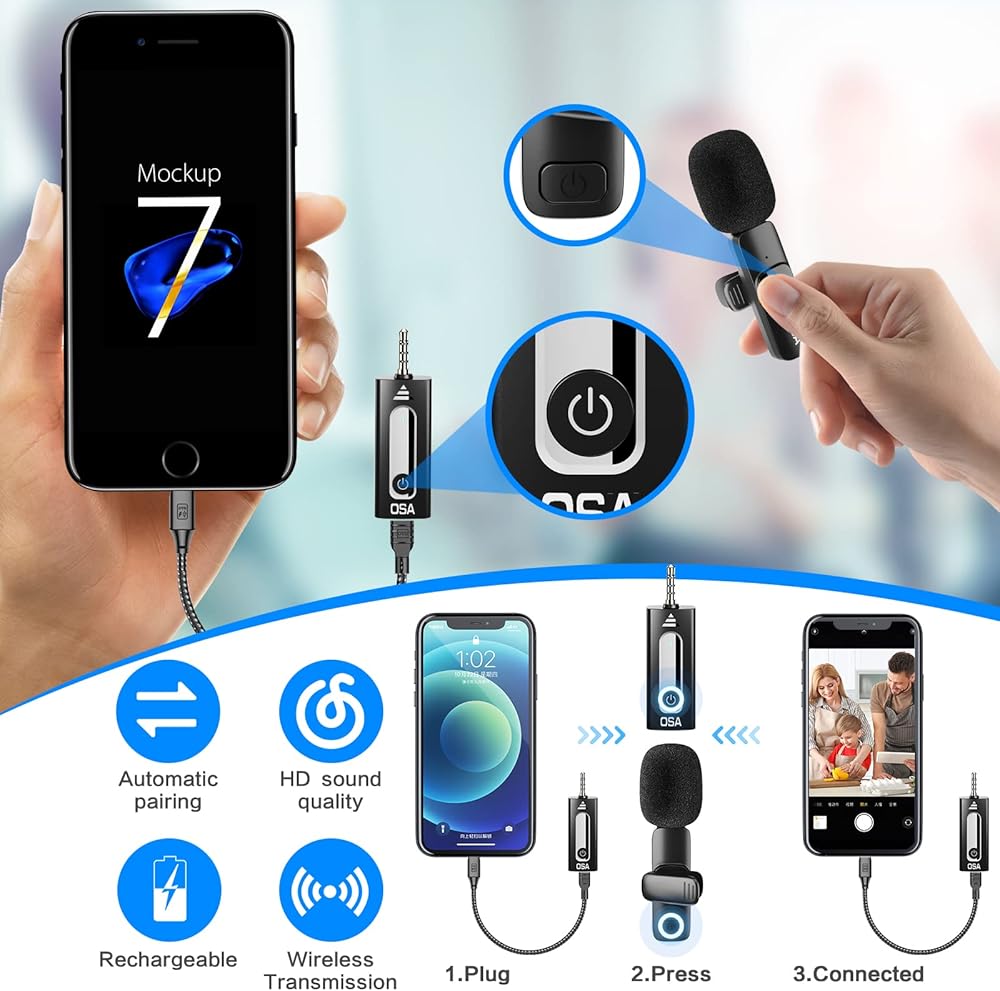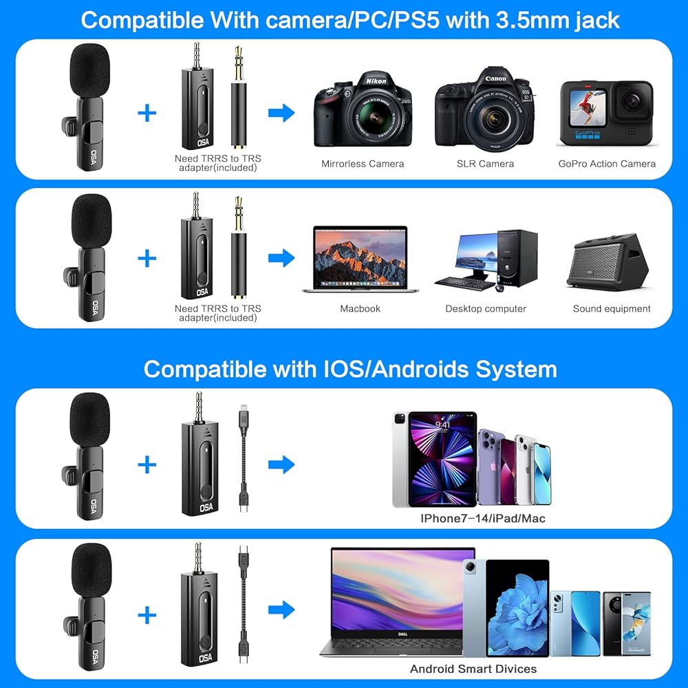 متوافق مع IOS/Android/الكاميرا: يتمتع الميكروفون اللاسلكي المتطور الخاص بنا بالتوافق الكامل، مع USB C، 3.5 مم TRS/ TRRS، كابلات محول iPhone التي نقدمها لك، يمكنك توصيل iPhone7-13، وسلسلة iPad Air/Pro بسهولة أكبر، معظم الهواتف الذكية التي تعمل بنظام Android، وكاميرا Canon EOS/Nikon، وكاميرات الفيديو المتنوعة، ومسجل الصوت، وأجهزة الكمبيوتر الشخصية، والكمبيوتر المحمول، وما إلى ذلك. (ملاحظة: تحتاج بعض هواتف Android إلى الانتقال إلى إعدادات النظام لفتح OTG)