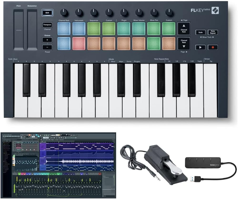 نوفيشن وحدة تحكم كيبورد ميدي ميني 25 مفتاح من اف ال كي لحزمة اف ال ستوديو مع 20 برنامج اصدار فاكهي (معبأ)، دواسة داعمة بنمط البيانو (اسود) وموزع USB 3.0 4 منافذ (4 عناصر)